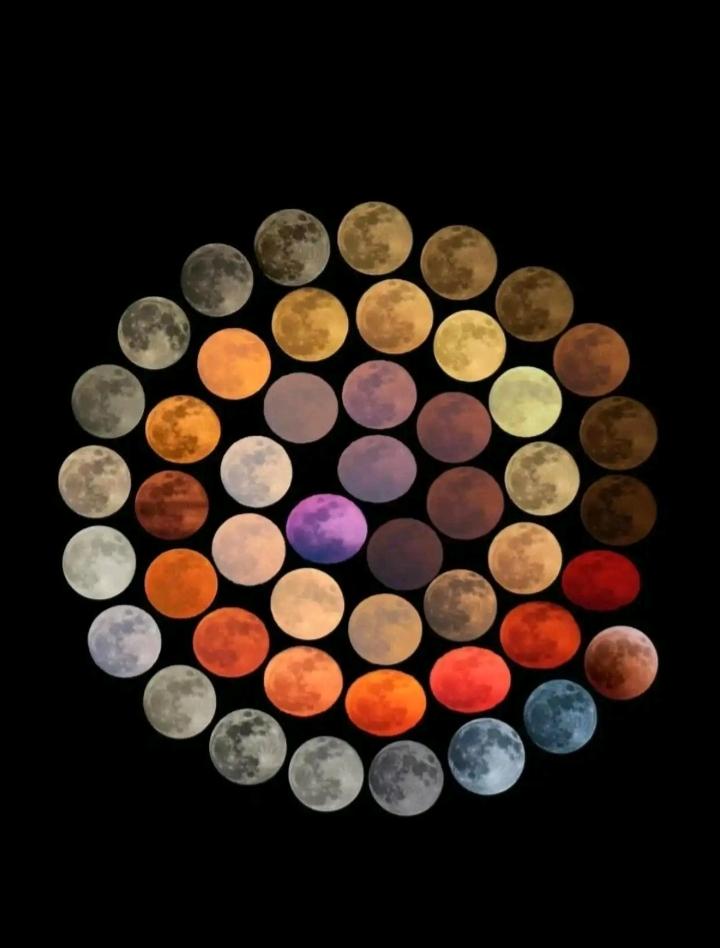 正如世界上没有两匹完全相同的树叶一样,我们每天见到的月亮也是不尽相同的。 除了形态上有满月、弦月等区别外,就是颜色也有细微差别的。 有时我们难以辨别,但如果把这些月亮堆在一起(如图),大家就能够分辨出它们之间的色彩差异了。