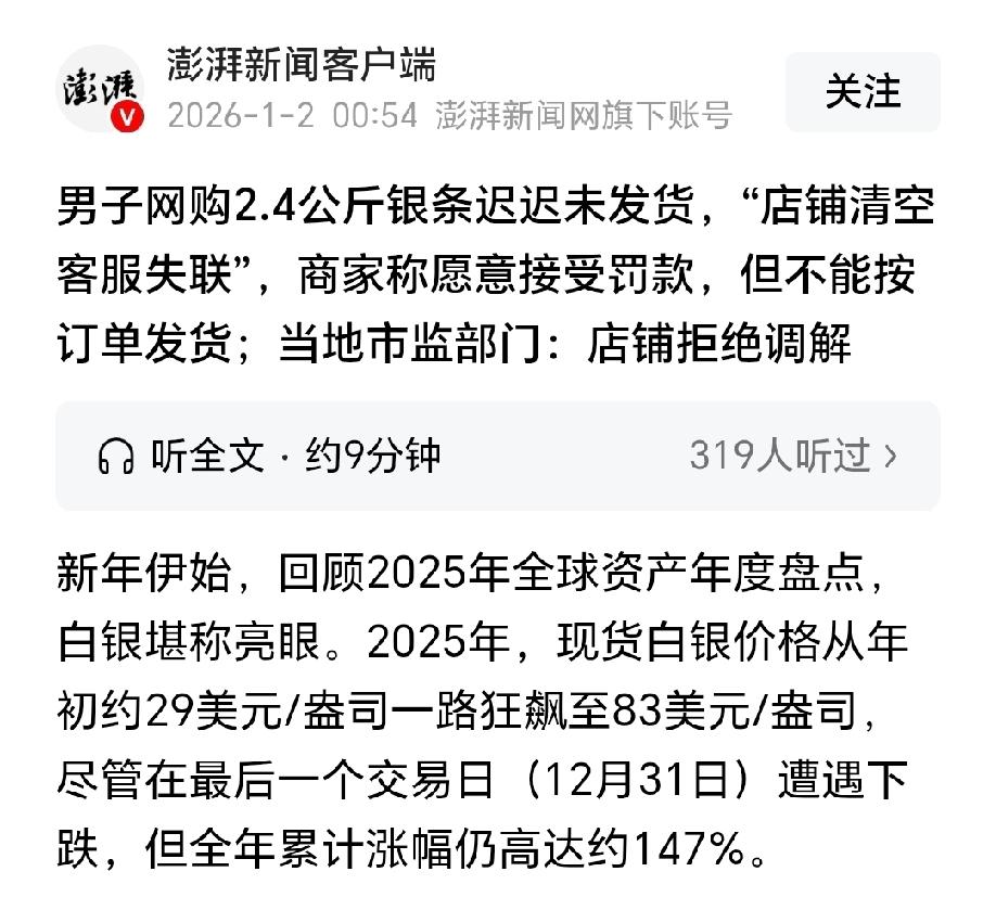 浙江温州,男子花3.68万网购了2400克银条,商家承诺48小时内发货,并保证涨跌都发货。付完款第二天,看到银价大幅上涨,男子心中窃喜,盘算着这次能大赚一笔,可还没高兴几分钟,他就发现店铺清空了,银条也不见了踪影。男子联系不上客服,只能找平台,平台却建议男子申请退款。男子:我买的时候15.3元每克,现在银价突破了20元每克,要么发货,要么给我补偿差价。不料,店铺老板宁愿接受罚款,也不愿按照订单发货。 2025年12月25日,徐先生的手指在手机屏幕上飞快点着,心里的小算盘打得噼里啪啦响。 他瞅准了白银市场的行情,在某电商平台的店铺里,分四笔订单屯下了2400克银条,每克15.3元,总共花了36836元。 这家店的价格比别家便宜好几毛,而且购买须知里明确写着“涨跌都发货”,不管银价是涨是跌,48小时内准保发货。 徐先生对比过好几家店铺,认为这家店铺的银条最可靠,觉得这波操作稳赚不赔,就等着银价涨起来小赚一笔。 付完款的第二天,徐先生习惯性打开行情软件,银价蹭蹭往上涨。 他心里一阵窃喜,手指头敲着桌子盘算,这2400克,每克涨一块就是两千四,要是多涨几块,那可不是小数目。 可这份高兴劲儿还没持续十分钟,徐先生再点开那家店铺,瞬间傻了眼。 店铺里的商品全被清空了,他买的银条链接更是消失得无影无踪。 他赶紧找人工客服,消息发出去石沉大海,连个自动回复都没有。 徐先生心里咯噔一下,一股不好的预感涌上来。他安慰自己,可能是系统故障,再等等说不定就好了。 可等到承诺的12月27日发货日期过了,别说银条了,商家那边连个屁都没放。 没办法,徐先生只能找平台维权。平台倒是很快回复了,12月29日说会催促商家尽快发货,让他耐心等消息。 可才过了一天,平台又变了口风,说已经尽力催促,建议他申请退款,再去别家选购。 退款?徐先生气不打一处来。他买的时候每克15.3元,12月29号银价都突破20元了,就算后来回落,也比他买的时候高不少。 这时候退款,不就等于把到嘴的肥肉拱手让人吗?他心里憋着一股火,跟平台表态:要么按订单发货,要么就补偿差价,少一分都不行。 为了讨个说法,徐先生还往信访平台递了投诉材料。信访局接到消息后,把这转给了当地市监局。 市监局倒是挺麻利,很快就受理了投诉,还组织了调解。 可调解的结果,让徐先生的心凉了半截,商家压根不配合,直接拒绝调解。 徐先生又求助记者,联系上这家店铺的法定代表人支先生,可支先生的话,更是让徐先生哭笑不得。 支先生表示,网店暑假找了七八个大学生实习运营的,学生们做完就走了,账号早就没人管了,空了三四个月,他自己都不知道还有卖银条这回事。 他还拿出后台数据佐证,说店铺从9月到12月24号,销售额几乎为零,结果12月25号一开盘,就卖了1372单,销售额高达495万多,全是被抢拍空的。 支先生还吐槽,徐先生一下子下了三四万的订单,明显是动机不纯,就是盯着银价上涨来薅羊毛的。 他强调,店里卖的银条是工艺品,得算加工费,不能只按银价算。网店的价格还是八九月定的固定价,早就跟不上现在的成本了。 最后支先生撂下话:退款可以,接受平台罚款也可以,但想让他按订单发货,门儿都没有。 目前,徐先生空有一份订单,却连银条的影子都没见着。 《民法典》第五百零九条规定:当事人应当按照约定全面履行自己的义务。当事人应当遵循诚信原则,根据合同的性质、目的和交易习惯履行通知、协助、保密等义务。 徐先生与商家的买卖合同自提交订单成功时即成立,商家在商品页面明确承诺“48小时内发货”“涨跌都发货”,这属于合同核心义务条款,对双方均具有法律约束力。 徐先生已按约定支付全部货款36836元,完全履行了买方义务,商家则需遵守承诺按时交付银条。 商家以“价格过时”“含加工费”“消费者动机不纯”为由拒绝发货,均不属于法定免责事由,不能成为商家逃避履约的理由。 商家清空店铺、失联拒发的行为,明显违反了全面履行合同义务的法律规定,构成根本违约。 《电子商务法》第二十条规定:电子商务经营者应当按照承诺或者与消费者约定的方式、时限向消费者交付商品或者服务,并承担商品运输中的风险和责任。 本案中,商家承诺48小时内发货却未履约,反而清空店铺、拒绝调解,既违反了约定交付义务,也违背了电子商务经营的基本诚信原则。 即便商家主张“网店由实习生运营、后续未维护”,也不能对抗消费者,支先生需要对公司经营行为承担法律责任,内部管理疏忽不能成为对外违约的免责理由。 因此,徐先生有权选择要求发货,或者因商家违约主张赔偿差价等实际损失。