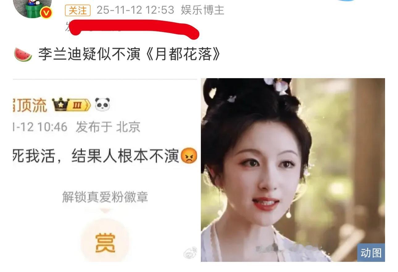 看来月都花落这项目确实🈚️了十一月网传兰迪不演,去战争和人。 然后现在瓜主说流了