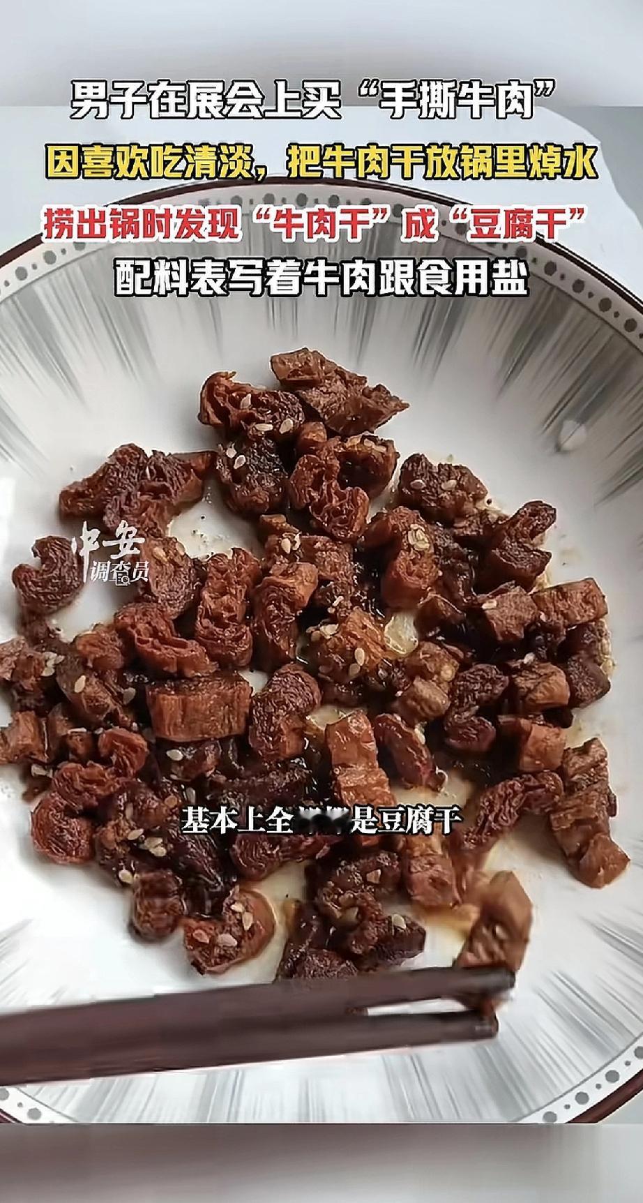 男子在展会上花75块钱一斤,买了“所谓的牛肉干”。回家想吃清淡点,就把牛肉干放进锅里焯水。结果捞出来一看,傻眼了:“牛肉干”全泡发了,变成软趴趴的“豆腐干”! 再一看配料表,上面干净简单的就牛肉和盐,可是里面几乎就没啥牛肉,主要就是大豆蛋白(豆腐干)和盐。这哪是牛肉干,分明是“豆腐干刺客”! 花钱买了教训:买食品看配料表也不一定是真的,别光听忽悠。75一斤买回一斤豆腐干,这“牛肉味”的学费,交得实在有点冤。
