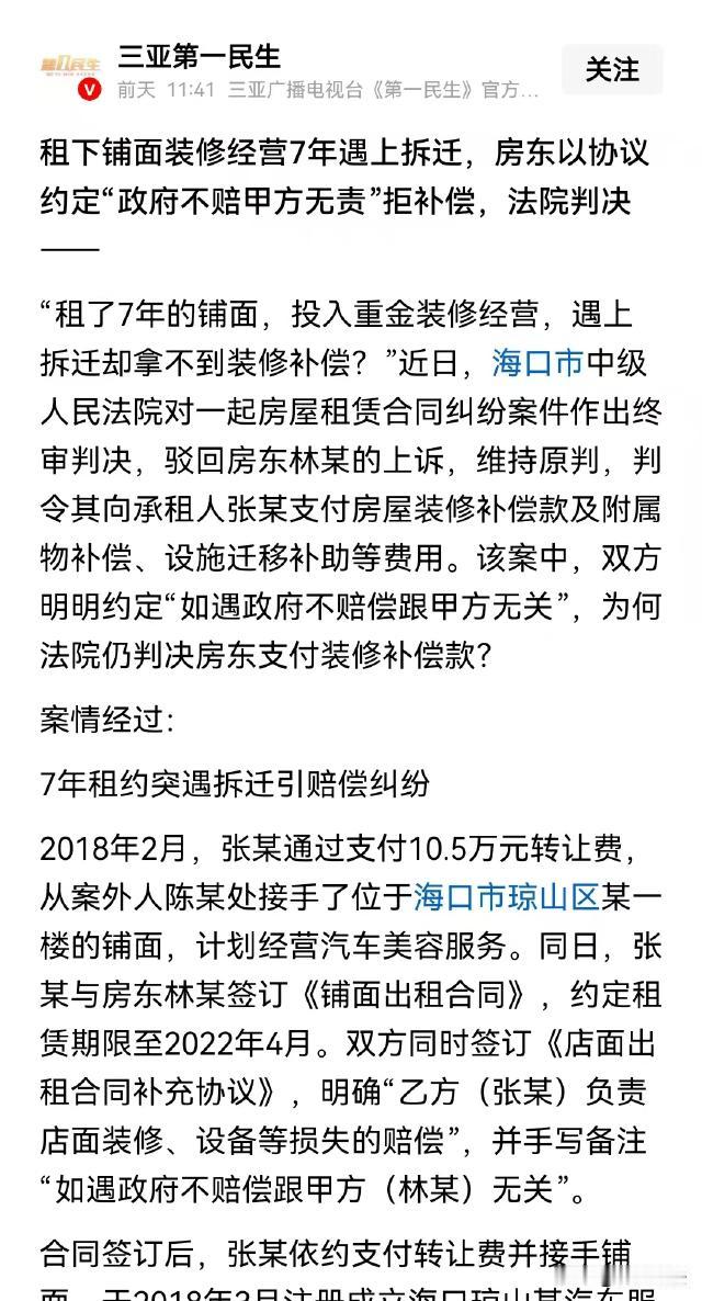 海南海口,张某租下林某的房子,开了一家汽车美容店,7年后林某的房子拆迁了,获得72万余元的补偿款。张某炸了:我花钱做的装修,现在房租没到期就拆迁了,你得赔我装修补偿、经营损失等,共计26万!双方官司打了一年多,经过一审二审,最终这样判。 据三亚第一民生报道,多年前,张某想开一家汽车美容中心,后来他看到琼山区有一间一楼商铺在转让。 2018年2月,张某花10.5万将这间商铺接手了过来。 当天,张某和房东林某签下了一份《铺面出租合同》,双方约定合同有效期到2022年4月。 同时,考虑到该位置可能会拆迁,张某又和林某签了一份补充协议,协议中约定,如果店铺拆迁,张某负责店铺装修和设备损失等赔偿,如果政府不赔偿,和林某无关。 随后,张某付了10.8万转让费,将房子租了下来,接着便紧锣密鼓张罗起了装修工作。 3月份,张某注册成立了一家汽车装饰美容中心,并先后投入不少钱用于添置设备。 2022年4月,张某的租房合同到期了,因为经营的不错,张某又和林某续租了5年。 两年后,也就是2024年5月,张某店铺附近一片区域被纳入了征收范围。 林某得到消息后,以儿子的名义和征收部门签下了《房屋预征收补偿安置协议》。 《评估分户报告》中载明,林某的商铺面积为114平,装修单价为350元每平,装修补偿金额为39900元。 但是,补偿明细表中,装修补偿金额写的却是0。 2024年6月,林某领到征收补偿款72万多元。 张某得知这件事后,立即找到林某,和他商议补偿一事。 林某说,他收到的是征收补偿款,里面没有列出装修补偿。当初他们签合同的时候就说好了,政府不赔偿装修,他不负责任。 可张某早就从别人口中得知,这次征收,里面已经包含了装修补偿。 双方闹得不欢而散,张某气愤之下,直接起诉了林某,请求解除双方合同,并要求林某支付装修补偿款39900元,以及设备、附属物补偿,搬迁补助和经营损失等,共计26万余元。 有人不明白,林某的房子拆迁,张某一个租户,有什么权利要补偿款? 事实上,张某这个租户,还真的有权利要求补偿,这是因为,双方在签订合同时,就对此进行了约定。 一审认为,2018年,张某与林某签订的《铺面出租合同》及补充协议是双方真实意思表示,具有法律效力。 补充协议约定若店铺拆迁,张某负责店铺装修和设备损失等赔偿,政府不赔偿则与林某无关。 2024年,房子被征收后,虽然补偿明细表装修补偿金额为0,但《评估分户报告》中写明,房子装修补偿为39900元。 也就是说,林某获得的72万余元的补偿款,实际已经包含了装修补偿。 《民法典》第四百六十六条规定,当事人对合同条款的理解有争议的,应当依据本法第一百四十二条第一款的规定,确定争议条款的真实意思。 林某不能仅依据补偿明细表中装修补偿为0,就认定未赔偿装修部分。 据此,一审判林某支付张某39900元装修补偿款。 另查明,房子里的附属物均为张某添置。 根据《民法典》第三百二十三条规定,用益物权人对他人所有的不动产或者动产,依法享有占有、使用和收益的权利。 张某作为承租人,对其添置的附属物和设施享有相应权益,当房屋被征收时,这些附属物和设施的补偿应归张某所有。 经核定,房子里的扒胎机、储气罐等附属物补偿6092元,以及电话空调等迁移补助500元,一审认为,此6592元,应当归张某所有。 至于张某主张的搬迁补助费及经营损失,一审认为,搬迁补助费是对房屋所有人因房屋被征收需要搬迁而给予的补偿,经营损失补偿通常也是基于房屋所有权人因房屋被征收导致经营中断的弥补。 张某仅为承租人,无权要求此补偿,并驳回了张某搬迁费和经营损失的主张。 综上,一审判林某支付张某装修补偿39900元,附属物赔偿6092元,设施迁移补助500元。 一审判决后,林某不服,并提起上诉,一审维持原判。