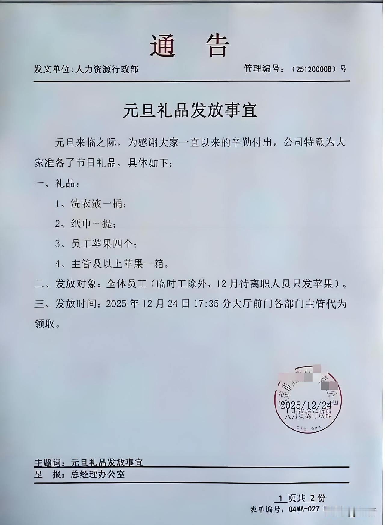 元旦礼品发放事宜,公司主管和普通员工的差别真大! 主管领导物资:洗衣液一桶,纸巾一提和苹果一箱。 普通员工物资:洗衣液一桶,纸巾一提和苹果四个。 看着这样的标准,真想吐槽这种公司,元旦佳节四个苹果是怎么拿出手的。要嘛就不要发苹果,要嘛就每人一件。 这不叫公司没钱,这叫公司大老板不动脑筋抠门。再说,就算抠门,也无需下发一个正式文件吧! 真的是丢人丢到家了,就是不知道内部这些员工会不会造反。元旦佳节破口大骂这位抠门的老板。