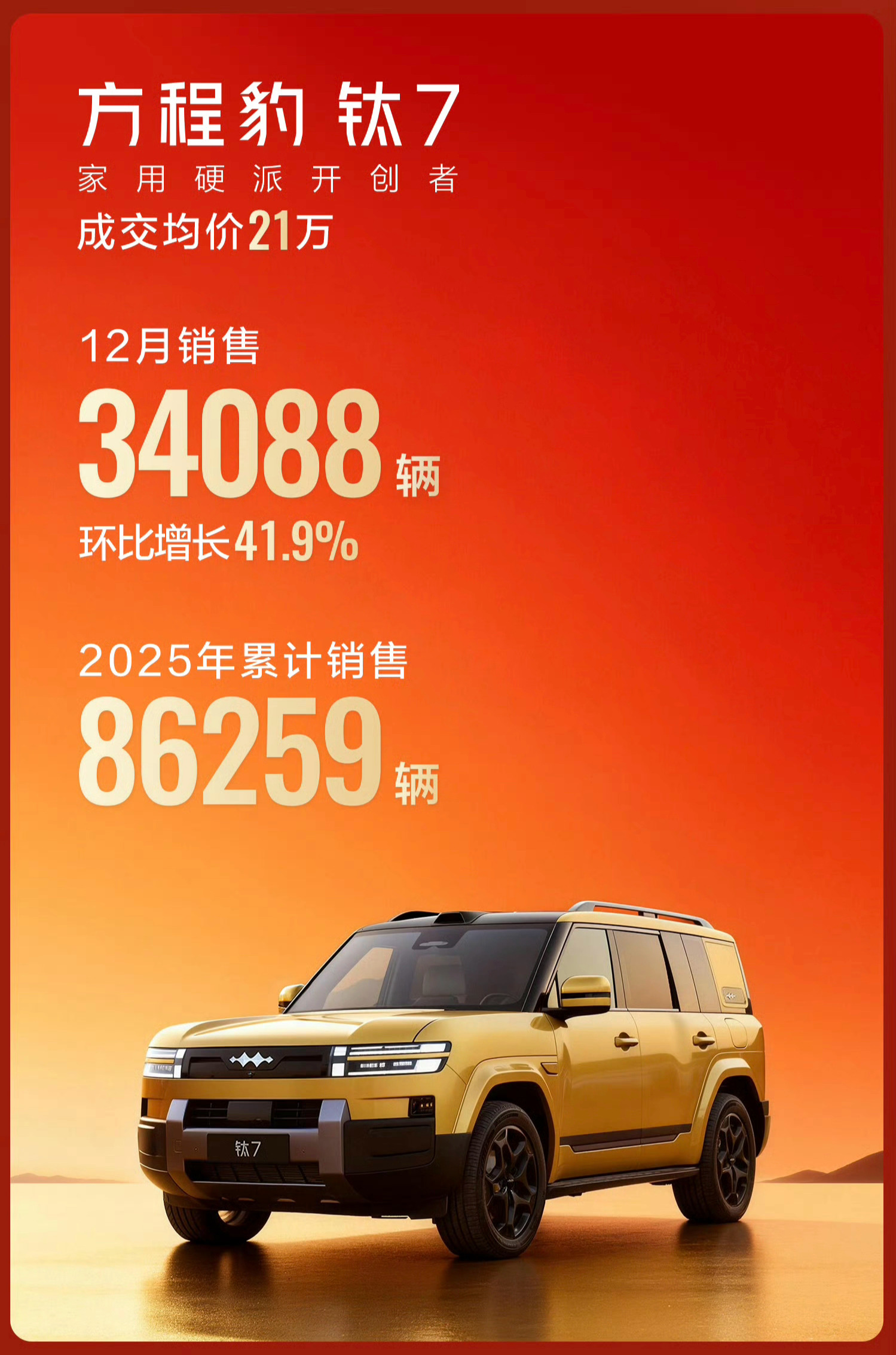 方程豹12月销量破5万了?钛7单月销量3.4万,好逆天的数字...这应该是2025年上市的全新车型里,仅次于小米YU7第二高的存在,真正的超级黑马