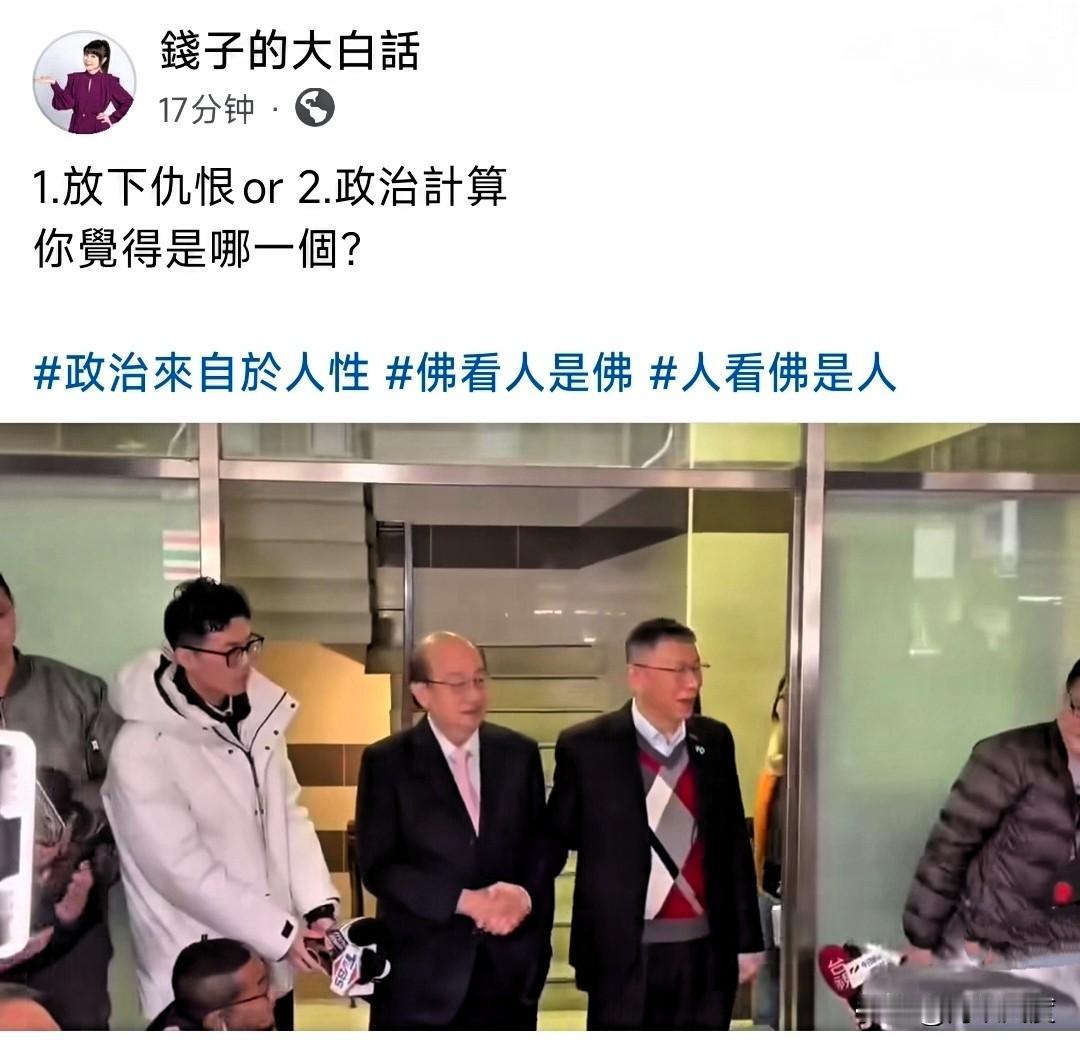 柯文哲会见柯建铭,TVBS主持人钱子脸书发问,是放下仇恨,还是政治算计,你觉得是哪一种?网友不淡定…… 有网友直接:兩個亦友亦敵之人,精算之後,才能決定共同的利益該怎麼分配才不會失算! 有网友戏言:二位落魄人該不會預約「土城見」?阿伯宜低調,否則一審恐被判10年以上! 有网友愤懑:政治計算佔99.9,決不能寬恕民進黨這些政客,對敵人心軟就是對自己殘忍,千萬不能心軟民進黨這些人。關押柯時,有心軟過嗎?大罷免期間,有仁慈過嗎?想想吧! 有网友不屑:當然是政治計算 ,一個怕關太久一個要拉票阿! 有网友痛心:演!君子報仇「2028」不晚,答案應該就是這個吧!如果藍白再失合,那就都只能是當罪人了吧! 有网友干脆:Byebye民眾黨! 今天柯文哲先见傅昆萁,再见柯建铭,原来前者是铺垫,后者是压轴?不过,现场末见黄国昌!不过谁在领导民众党?小草不会跑光光?