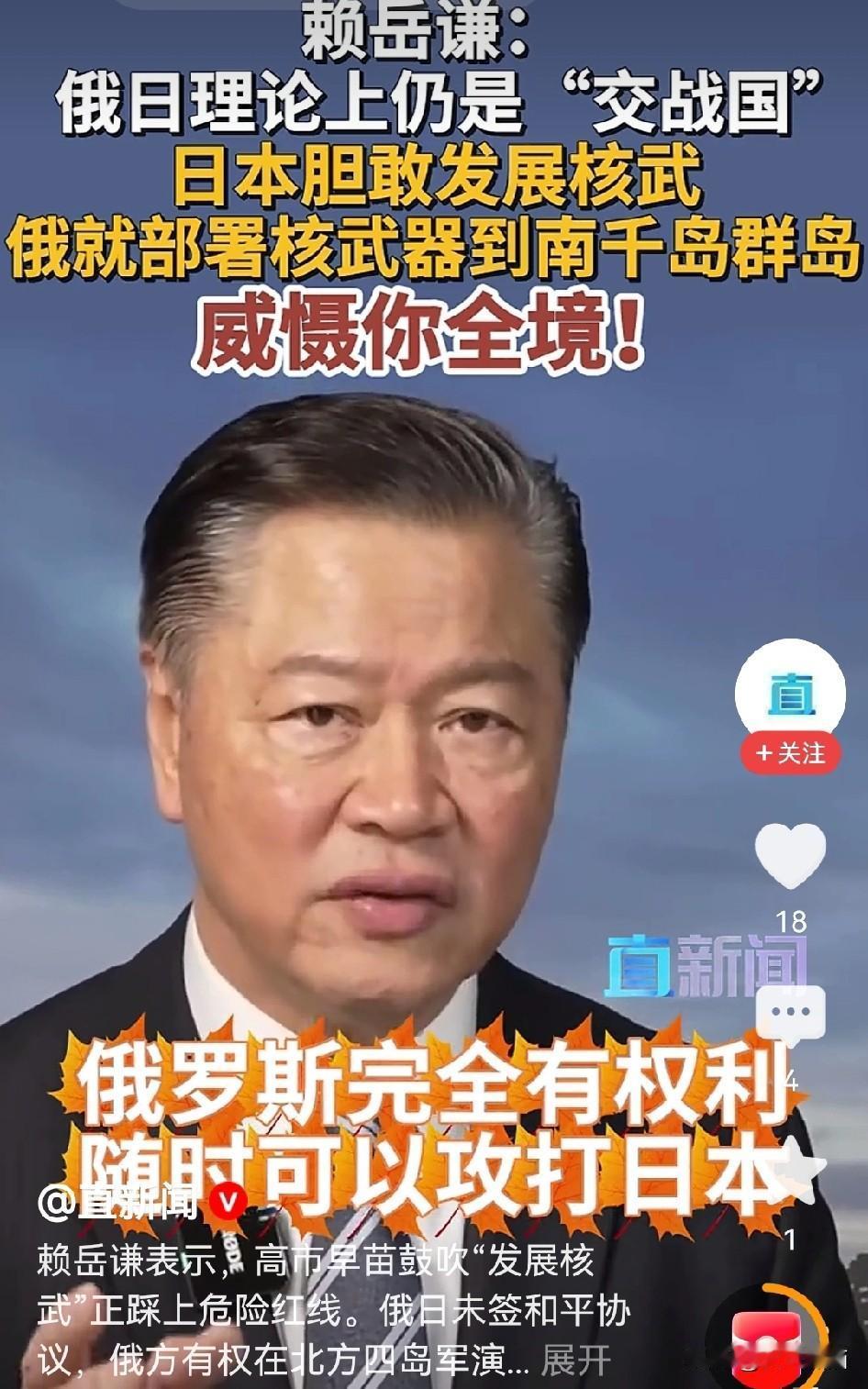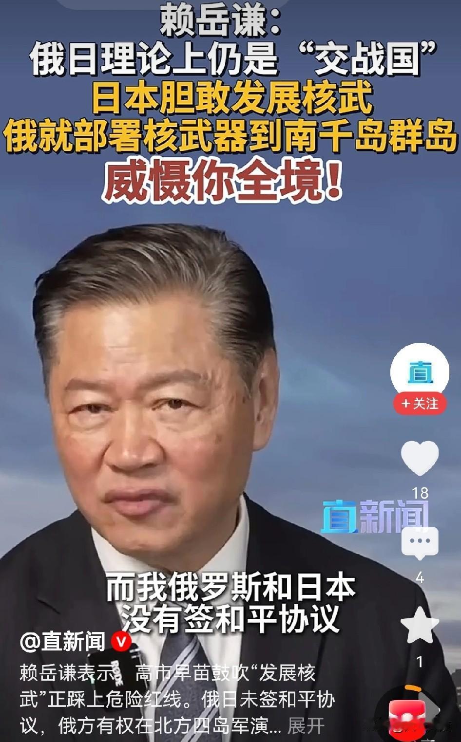 俄罗斯的眼光就是厉害! 竟然和日本之间没有签署和平协议。 说的直白一点,就是在理论上偶尔之间还是“交战国”的状态,也就是保留了俄罗斯对日本的打击权利。 这源于1月1日,高市早苗表示“不排除将来在海军潜艇上使用核动力的可能性”,这也就是说日本已经有了发展核武器的打算。 俄罗斯方面对此反应强烈,并且严重警告日本如果发展核武器,俄罗斯将不得不采取打击措施。 战胜国就应该这样,对于挑起事端的国家必须毫不留情才行。