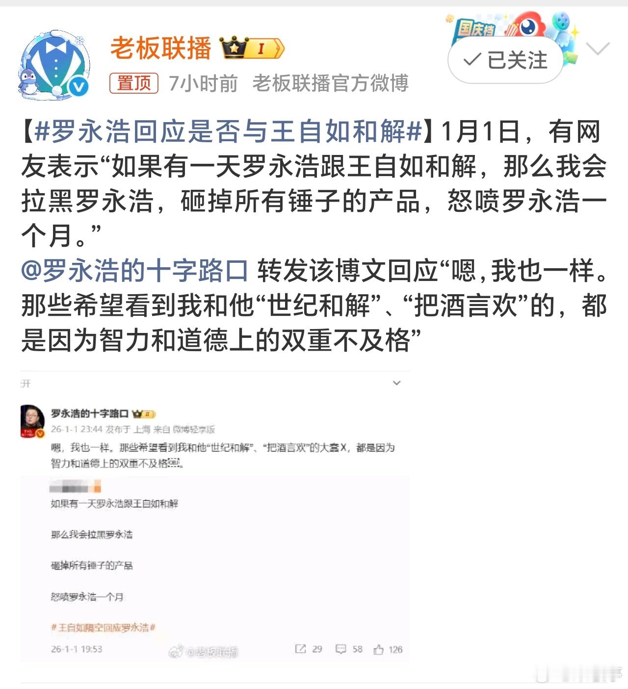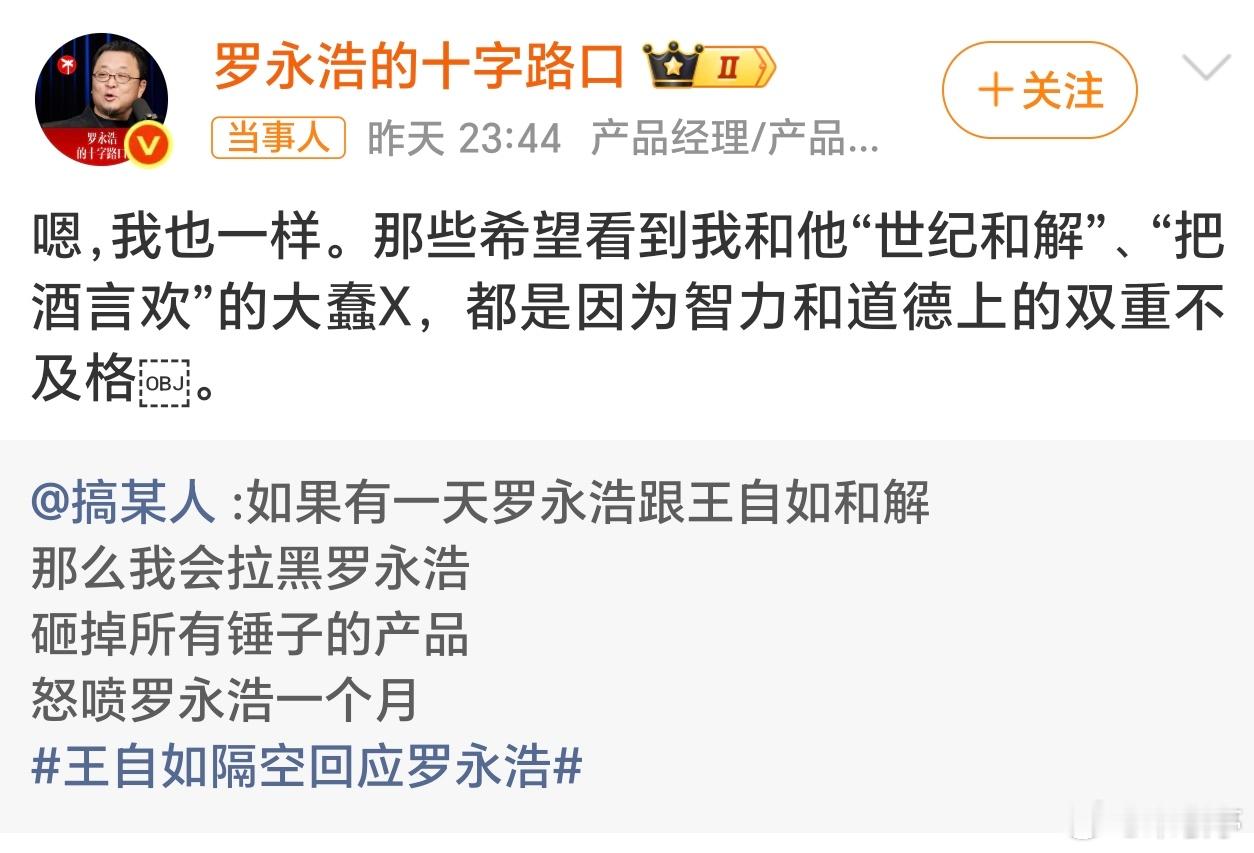 罗永浩回应是否与王自如和解这种话题也是无聊,一场直播对线后也没什么交集!谈不上和解不和解!