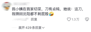 我小姨在我家切菜,刀有点钝,她说:这刀,我骑回沈阳都不刺屁股