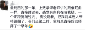 最纯困的那一年,上数学课老师讲的跟催眠曲一样,直接睡过去,感觉有条狗在咬我腿,一个正蹬腿踹过去,狗没踢着,把我前桌连人带椅踹翻了。哥们坐第二排,我前桌直接给老师拜了个早年