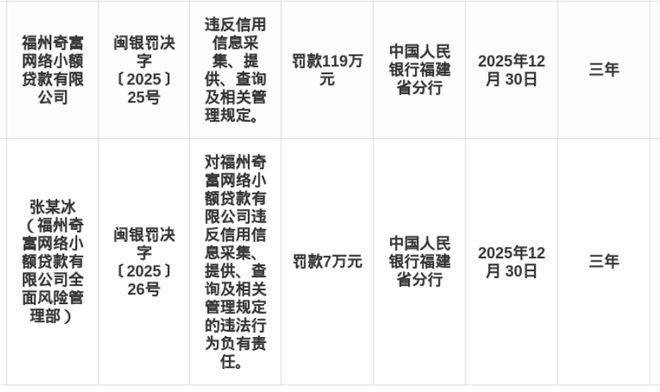 蓝鲸新闻1月2日讯,近日,中国人民银行福建省分行发布了罚单,剑指福州奇富网络小额贷款有限公司及其相关责任人。
