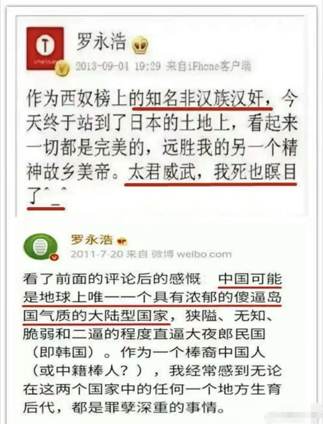 “吵架王”罗永浩离封号不远了 素有“网络平头哥”之称的罗永浩是个什么人呢?大家看看上面截图就知道了,他还有许多类似言论,这里不一一赘述。就是这么一个人,却在公开场合嘲讽中国科技和制造业脊梁华为。或许华为对罗永浩来说是一个笑话,可他怎么知道华为是中国的一个笑话呢?显然是他狂妄地代表了中国,或者是他想代表中国,可这么一个“精神日本人”怎么可能代表中国呢? 现在罗永浩竟然嘲讽华为这些年负重前行为我们赢得的战略性转机是中国的一个笑柄,他算什么?一个到了日本就“死也瞑目”、喊着“太君威武”的精神日本人,一个不懂感恩、连续二十年辱骂自己恩人的薄情寡义之人,有什么资格嘲讽华为?