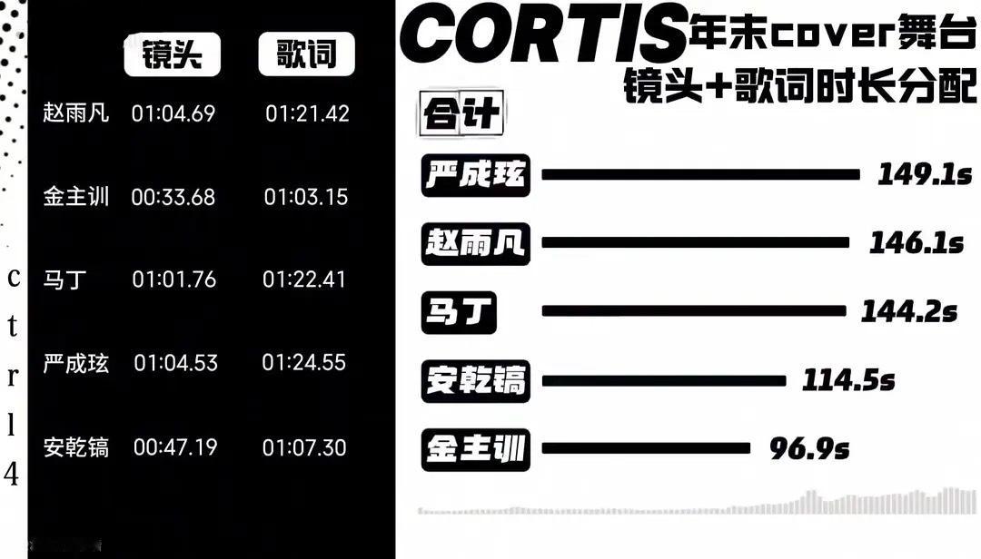 Cortis年末四首 Cover part大拉表来了 1️⃣严成玹 149.1s2️⃣赵雨凡 146.1s3️⃣Martin 144.2s4️⃣安乾镐114.5s5️⃣金主训 96.9s