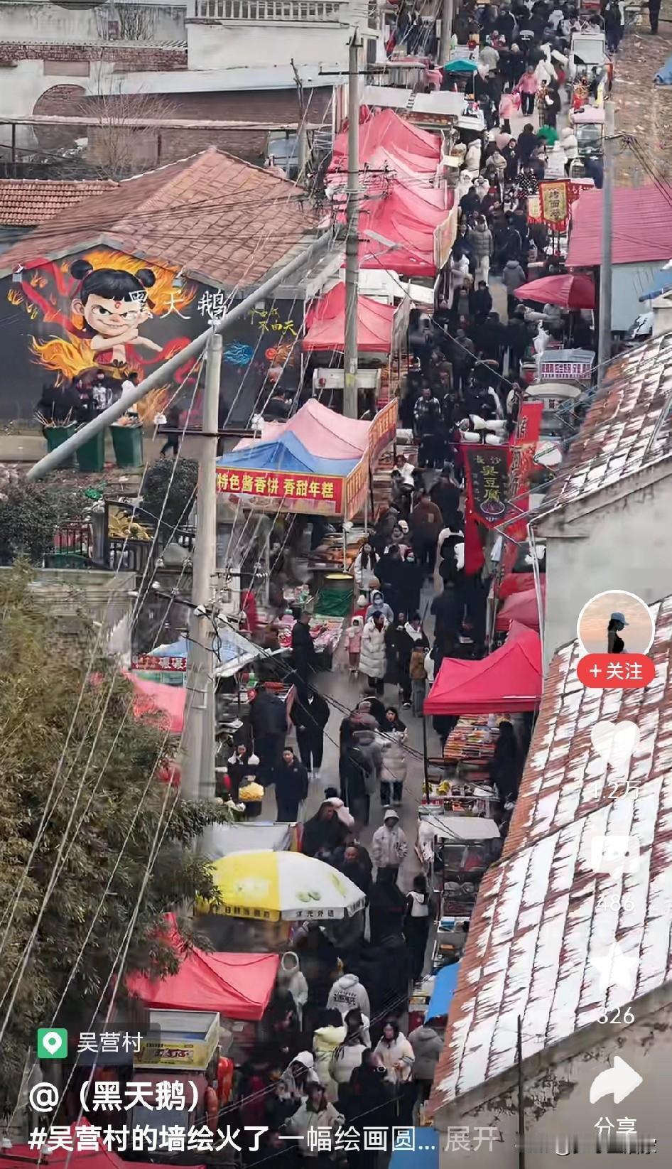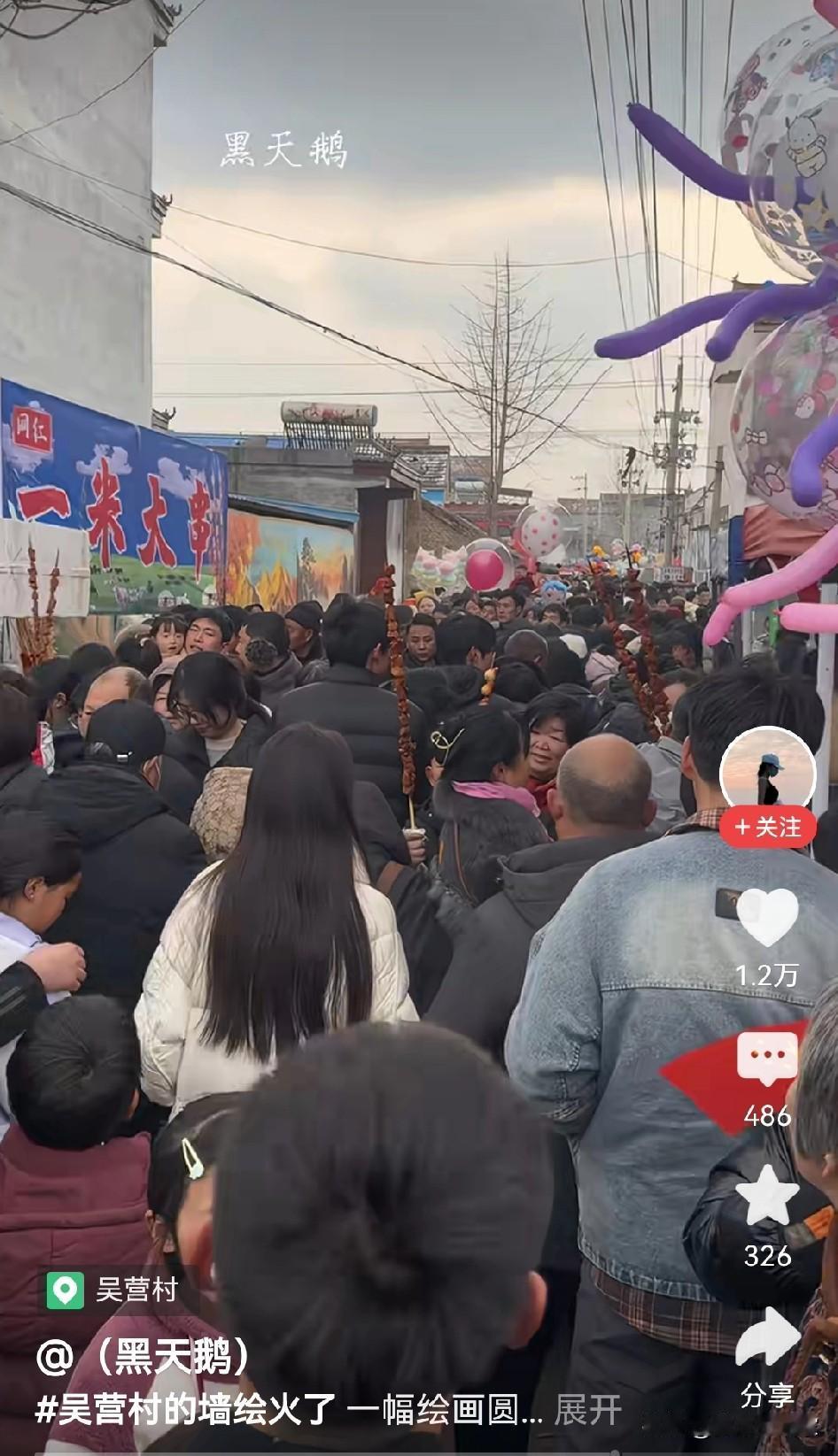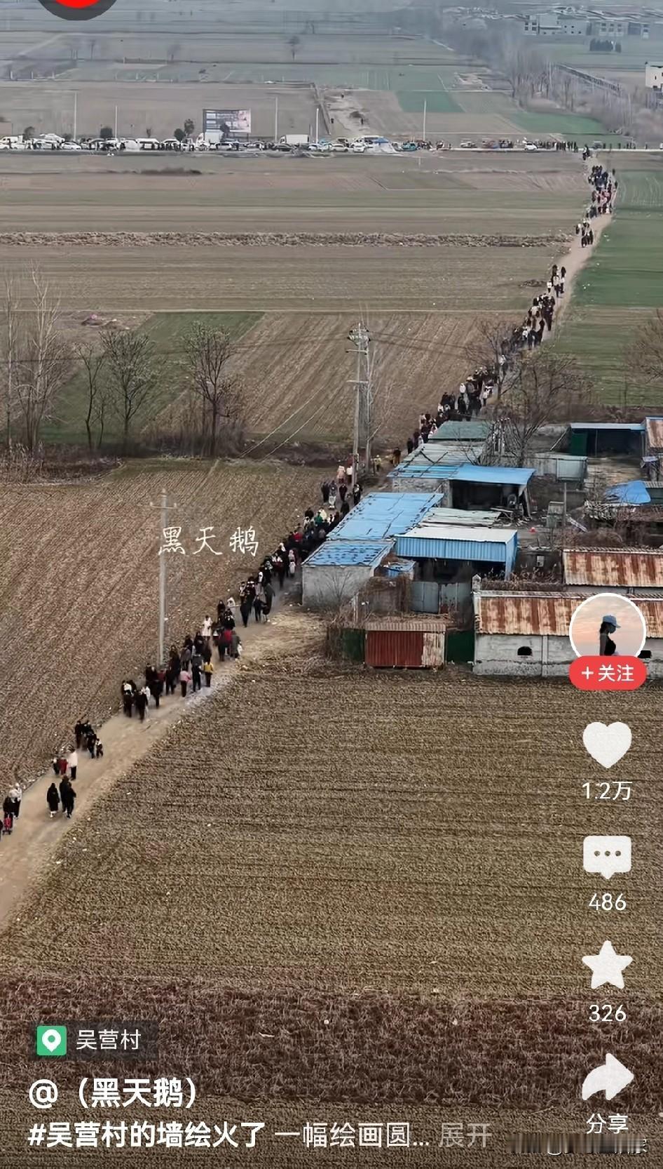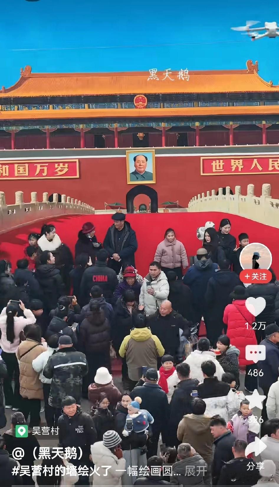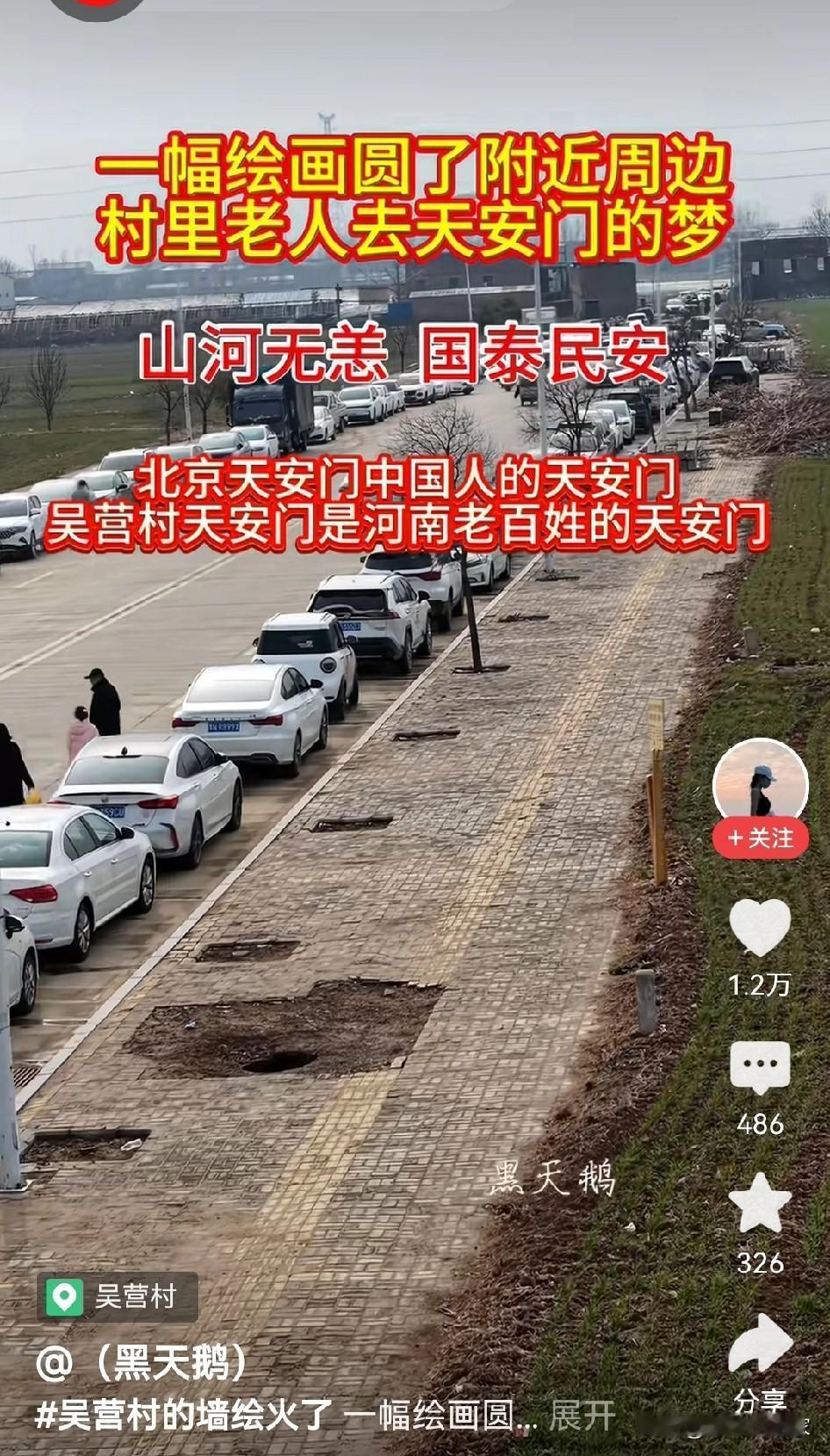 一幅画带动一个村。 这个元旦假期吴营村成了大家打卡点, 大家带着信仰来到手绘“天安门”, 艺术不只是高高在上, 有人说那是阳春白雪, 但群众的眼睛是雪亮的, 下里巴人也有欣赏的自由, 人民需要贴近群众的艺术家, 而不是身在芝加哥唱着中国心的, 也不需要哭穷每年消费80万的, 有了人民的喜爱才能长久, 还是那句好水能载舟亦能覆舟。 天安门墙绘