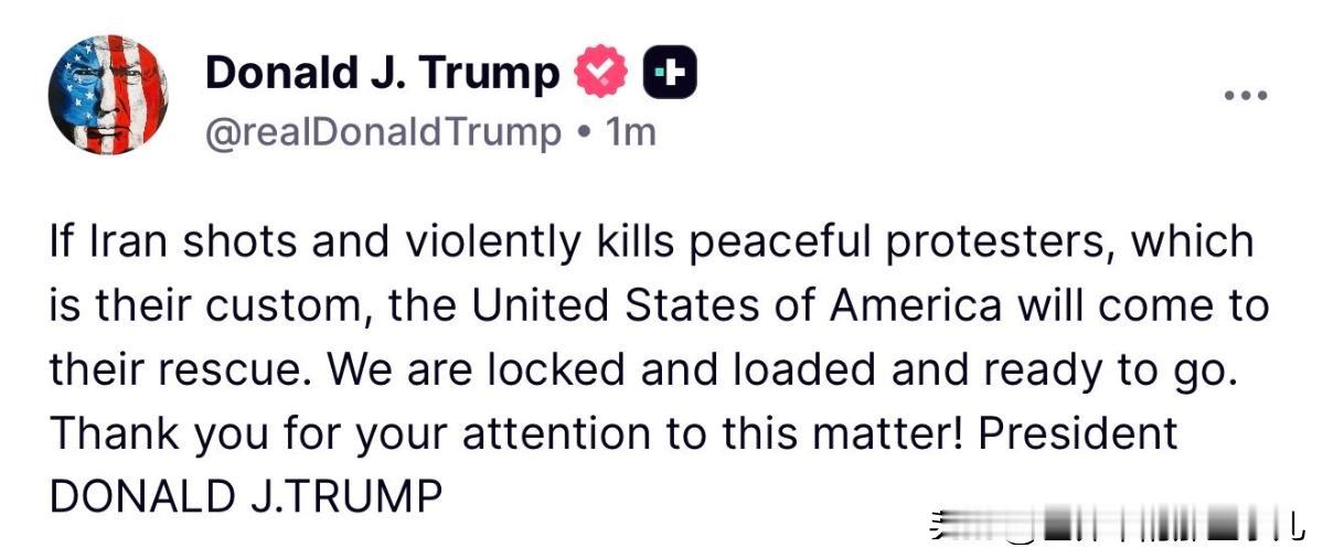 特朗普表示,如果伊朗杀害示威者,美国将出手相助!伊朗表示,如果美国干涉,将遭受重创!1月2,晚间看点, 据特朗普发文表示,如果伊朗像往常一样枪击并暴力杀害和平示威者,美国将出手相助。我们已做好充分准备,随时可以行动。感谢各位对此事的关注! 据伊朗最高国家安全委员会秘书阿里·拉里贾尼就美国总统唐纳德·特朗普威胁支持伊朗抗议者一事回应称,美国干涉伊朗内政等同于破坏整个中东地区的稳定,并将导致华盛顿在该地区的利益遭受重创。 这位伊朗安全官员在其社交媒体账号上写道:“我们认为抗议商户的立场与破坏分子截然不同。特朗普应该明白,美国干涉伊朗内政等同于在整个地区制造混乱,并损害美国的利益。” 拉里贾尼表示,特朗普的这条帖子清楚地表明了谁是幕后黑手,谁试图破坏伊朗局势的稳定。 这位伊朗安全官员说:“美国人民应该明白,是特朗普挑起了这场冒险主义。他们应该照顾好自己的士兵。” 12月29日,由于伊朗货币暴跌,德黑兰市中心爆发了商户抗议活动。伊朗总统马苏德·佩泽什基安指示内政部长与抗议者展开对话,并宣布对该国的银行和金融部门进行改革。 综合来看(个人观点)当我看到伊朗全国大规模抗议演变为暴力冲突的时候,我就知道是美国和以色列搞的鬼。我之前说过以色列前段时间向美国汇报要对伊朗下手。现在我认为美国和以色列已经开始了,美国发动颜色革命,以色列则发动爆破和刺杀等间谍优势。如果伊朗不能快速控制局势,以色列很有可能会趁着伊朗大乱的时候袭击伊朗,将伊朗彻底去军事化。 现在特朗普的发言已经证实,这就是美国和以色列搞得鬼。只不过这次美国和以色列发动的是综合战争,从经济账、颜色革命、制造混乱等等未来不排除军事干预。 现在伊朗反应了过来,现在就看伊朗能不能快速平息! 对于以上事件你有什么看法,欢迎评论区留言探讨,你怎么看呢?关注我,获取更多国际精彩资讯!