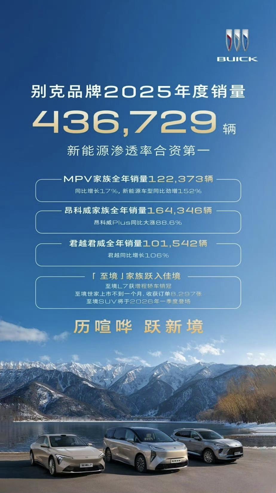 别克品牌2025年度销量43.6万辆,其中: 🚗MPV家族全年销量12.2万辆,同比增长17%,新能源车型同比劲增152%。 🚗昂科威家族全年销量16.4万辆,昂科威Plus同比大涨88.6%。 🚗君越君威全年销量10.1万辆,君越同比增长106%。 🚗至境L7获增程轿车销冠。 🚗至境世家上市不到一个月,收获订单8297张。 🚗至境SUV将于2026年一季度登场。 别克至境世家【来自懂车帝车友圈】