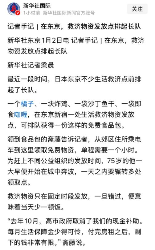 新华社发布重磅好消息,日本东京人民最近没饭吃了:天呀,都 2026 年了,东京人民还吃不上饭,太可怜了!2026 年 1 月 2 日,新华社记者梁晨给国内发来了重磅好消息,这记者手记有水平,可以获评日本东京新闻奖,一开头就描述了日本东京生活救济处的悲惨场景:一个橘子,一块炸鸡,一袋沙丁鱼干,一袋即食咖喱,日本东京人民就排长队去领,“一旦错过,便意味着当天少一顿饭”! 2026 年的新年余温尚未散尽,东京新宿、池袋等多地的生活救济点前,已排起蜿蜒的长队。 队伍里的人们衣着朴素,眼神裹着疲惫,手里攥着简单的布袋,只为领取那份勉强够一餐的食物包。 75 岁的斋藤是其中一员,他从郊区住所出发,搭乘一小时电车才能赶到发放点,为了多攒一点食物,每天要辗转好几处,赶在每个点固定的发放时段前抵达。 “去年 10 月,高市政府取消了我们的现金补助,” 斋藤的声音透着无力,“每月的生活保障金本就微薄,付完房租后,根本剩不下多少钱买吃的。” 池袋的救济点旁,一位单亲母亲抱着孩子默默排队。 她在百货公司做销售员,却并非正式员工,收入不稳定还得独自抚养孩子。 “只要遇到一点额外支出,比如孩子生病或是家里电器损坏,生活立刻就撑不住了。” 她的话道出了许多人的处境。 这样的场景并非个例,跨年夜的东京东池袋中央公园,300 多人冒着严寒排队,只为领取公益组织发放的年夜饭 —— 一盒便当、一袋面包和一个橘子。 本该阖家团圆、享用美食的时刻,他们却要为最基本的温饱奔波。 在东京深耕救助工作 25 年的公益组织负责人清野贤司,对这样的变化感触尤深。 过去领取救济物资的多是老年人,近年来年轻人的身影却越来越多,尤其是非正式雇佣者和打零工的群体。 “他们手头没什么积蓄,一旦收入中断,就只能来这里求助。” 清野所在的机构年运营经费约 3000 万日元,九成依赖个人捐款,物价上涨却不断挤压着救助范围。 “米价太高了,我们也想多给大家分点粮食,但那样成本会大幅上升,实在没办法。” 日本 2025 年 12 月的官方数据显示,一袋 5 公斤装的大米平均价格已涨到 4337 日元,折合人民币约 193 元,处于近年来的高位。 粮食价格的暴涨绝非偶然,背后是日本农业体系长期积累的矛盾。 自上世纪 70 年代起,为保护农民利益和农协收益,日本推行 “减反政策”,通过补贴鼓励农民减少水稻种植面积,人为控制供应以维持米价稳定。 这一政策虽在 2018 年名义上废除,却通过其他形式延续,导致水稻种植面积从高峰期的 300 多万公顷降至如今的 135 万公顷左右,年产量也腰斩至 700 万吨上下。 2023 年的极端高温天气让大米减产,2024 年供需缺口进一步扩大,最终引发价格暴涨。 日本农协掌控着全国八成以上的稻米流通渠道,他们从农民手中收购大米后,并不急于全部投放市场,而是通过控制流通节奏维持高价。 2025 年春季,政府为平抑物价投放了 41 万吨储备米,可其中 95% 都被农协及其关联企业收购,最终只有约 7% 流入零售市场,普通民众根本没享受到政策红利。 同时,日本对进口大米征收高额关税,免税进口额度仅 77 万吨,相对于全国年消耗量 700 万吨来说杯水车薪,无法从根本上缓解供应紧张。 物价上涨的影响持续扩散,官方数据显示,日本衡量贫富差距的基尼系数已创近年来新高,超过一半的家庭认为自身生活状况 “困难” 或 “较为困难”。 2025 年 7 月至 9 月,日本家庭食品支出占比达到 28.3%,是现行统计标准实施以来的季度最高水平。 另一家公益组织理事长大西连坦言,物价上涨让生活困窘和物资短缺成为常态,日本政府并不了解贫困群体的真实处境,也没有采取有力的应对政策。 日本政府 2025 年底发布的 2026 财年经济展望报告,将实际 GDP 增长率预期上调至 1.3%,名义增长率达 3.4%,描绘出内需引领经济增长的复苏蓝图。 但民间机构和日本央行的预判却更为保守,民间预测均值仅为 0.8%,央行预测中值更是低至 0.7%。 这种官方与民间的预期差距,恰恰反映出日本经济的结构性问题 —— 光鲜的增长数据背后,是普通民众难以承受的生活压力。 高市政权推出的逾 20 万亿日元大型经济对策,并未有效传导到基层,社会保障体系的短板在物价上涨的冲击下暴露无遗。 东京作为日本的首都,一直以繁华、富裕的形象示人,GDP 常年位居世界前列。 但如今,这里却出现了大规模民众排队领救济粮的场景,让人不得不重新审视这座城市的真实面貌。
