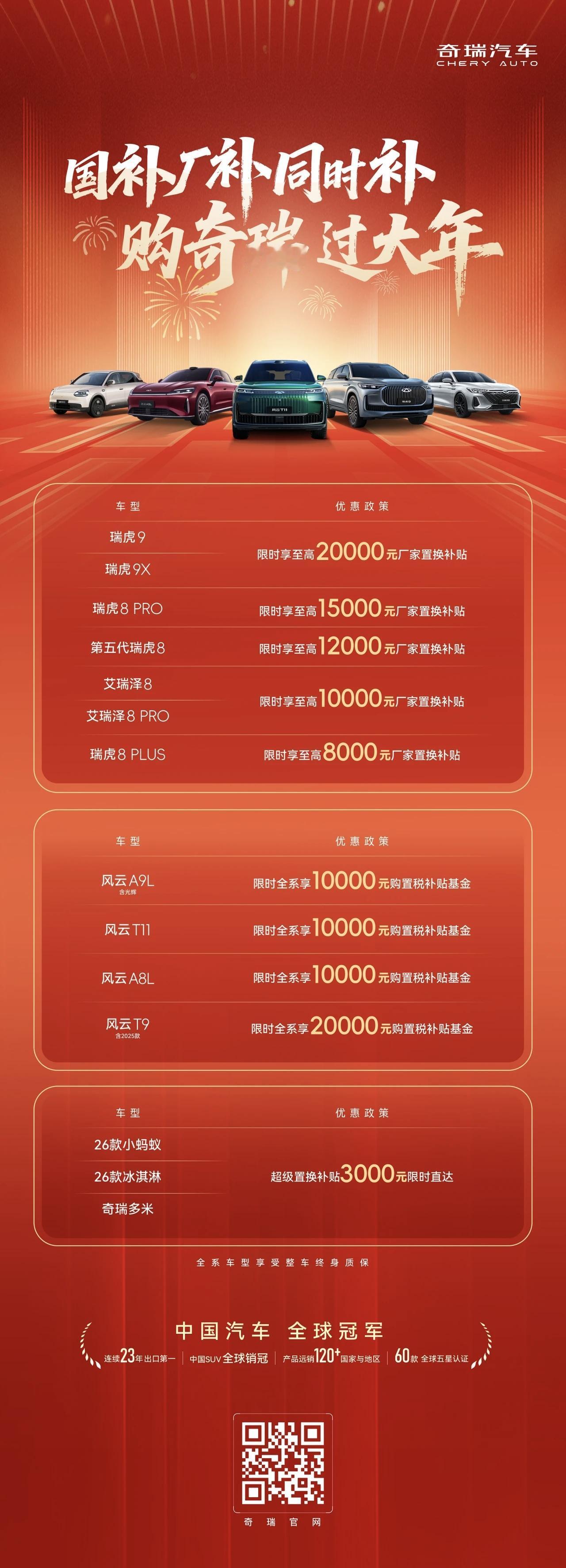 打脸那些说26年补贴,会退坡的了。 你看看这还没三天,奇瑞就开始放大招了。 都是真金白银8000,1万起步的补贴,最高补贴到2万。 所以大家不要着急买车,还是那句话: 早买早享受,晚买享折扣。 目前我觉得奇瑞在10万内的纯电市场,没有像吉利星愿,长安启源Q05,零跑A10,比亚迪元up那种明星产品,期待奇瑞出一款10万以内带激光雷达的产品。 2026年期待全新奇瑞QQ3的上市。 奇瑞