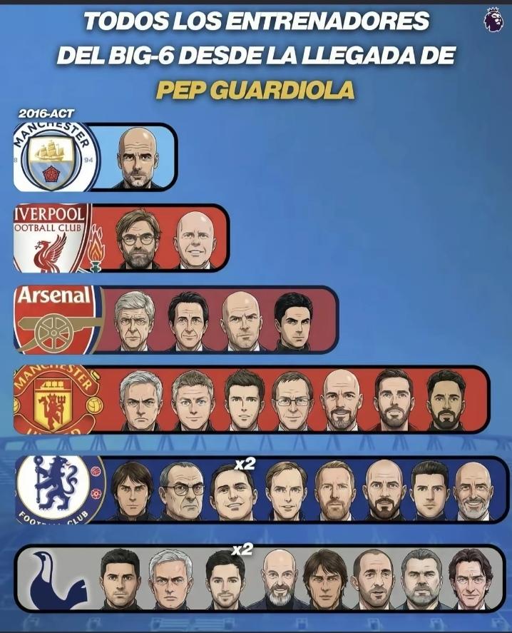 英超big6最近十年主教练情况。 曼城:肯定是最近十年英超的第一俱乐部,在瓜迪奥拉带领下比较稳定; 利物浦:成绩仅次于曼城,也只经历过两次换帅!上赛季以为会平稳度过后渣叔时代,但这个赛季红军很难; 阿森纳:温格之后阿森纳一直在重建,现在阿尔特塔确实有希望带领阿森纳复兴; 曼联:可以说是英超十年最为动荡的俱乐部; 切尔西:车子最为动荡应该是最近几年,年轻球员买了一大堆但总是捏合不到一块,教练来来回回换了不少; 热刺:感觉毫无希望!