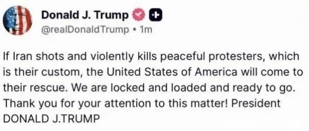 美国总统老特在“真实社交”上对伊朗发出威胁:如果伊朗像往常一样枪击并暴力杀害和平示威者,美国将前来救援。 老特的嘴上就缺个把门的,整天张嘴胡咧咧。就美国现在这衰样,连也门胡塞武装都摁不住,迟迟不敢对委内瑞拉动手,还想出兵去打伊朗这么大的国家,纯属口嗨。如果要想让人觉得有可信度,老特先往中东增兵30万。