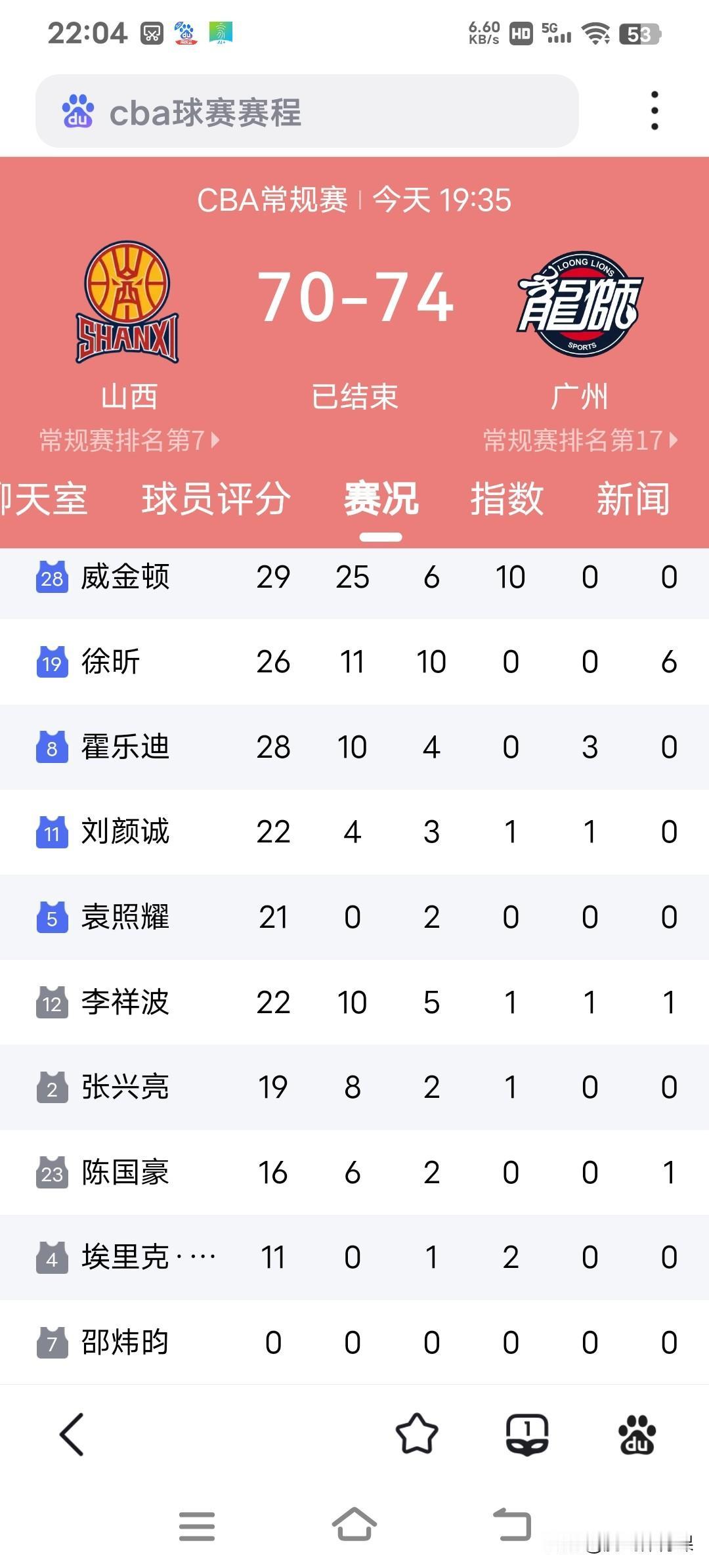 徐昕两双加6次盖帽,广州客场74:70击败山西,这四人是赢球最大功臣。 1.徐昕--全场出战26分钟,全场9投5中,贡献11分10篮板6次助攻。 2.威金顿--出战29分钟,全场23投9中,贡献25分6篮板10次助攻,其中有7次罚球命中6个。 3.李祥波--出战22分钟,全场8投4中,贡献10分5篮板2次助攻1次抢断1次盖帽。 4.霍乐迪--出战28分钟,全场9投3中,贡献10分4篮板3次抢断,其中3次抢断都化成得分进账。 徐昕本场比赛表现相当高效率,对位刘传兴完全站上风,不仅送刘传兴3次盖帽,比赛最关键时刻在刘传兴头上空中暴扣,这一进球基本锁定杀死了比赛,徐昕也成为本场比赛赢球最关键球员。