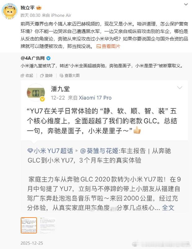 只要对比测试是公平科学的、测试环境和条件是透明公开的、结果是可溯源的,就属于正常的技术对比、是良性竞争,不应随意被曲解为破坏营商环境、营商环境的保护不能随意地扩大化,不要动不动就把正常的技术性测试对比扣上影响营商环境的大帽子。维护健康的营商环境,目的是防止价格战、恶意诋毁、虚假宣传等手段的内卷式恶性竞争,而不是禁止正当的、激烈的良性竞争。判断是正常竞争、还是恶性内卷,核心要点在于要看是不是在技术、质量、服务、品牌上进行比拼,要看是不是推动了价值创造、是不是推动了技术进步。一个健康的商业环境,应当鼓励的是在阳光下凭硬实力进行的较量。当所有企业都致力于提升自身技术、质量和服务,整个行业和消费者都必将从中受益,这才是最优的营商环境。