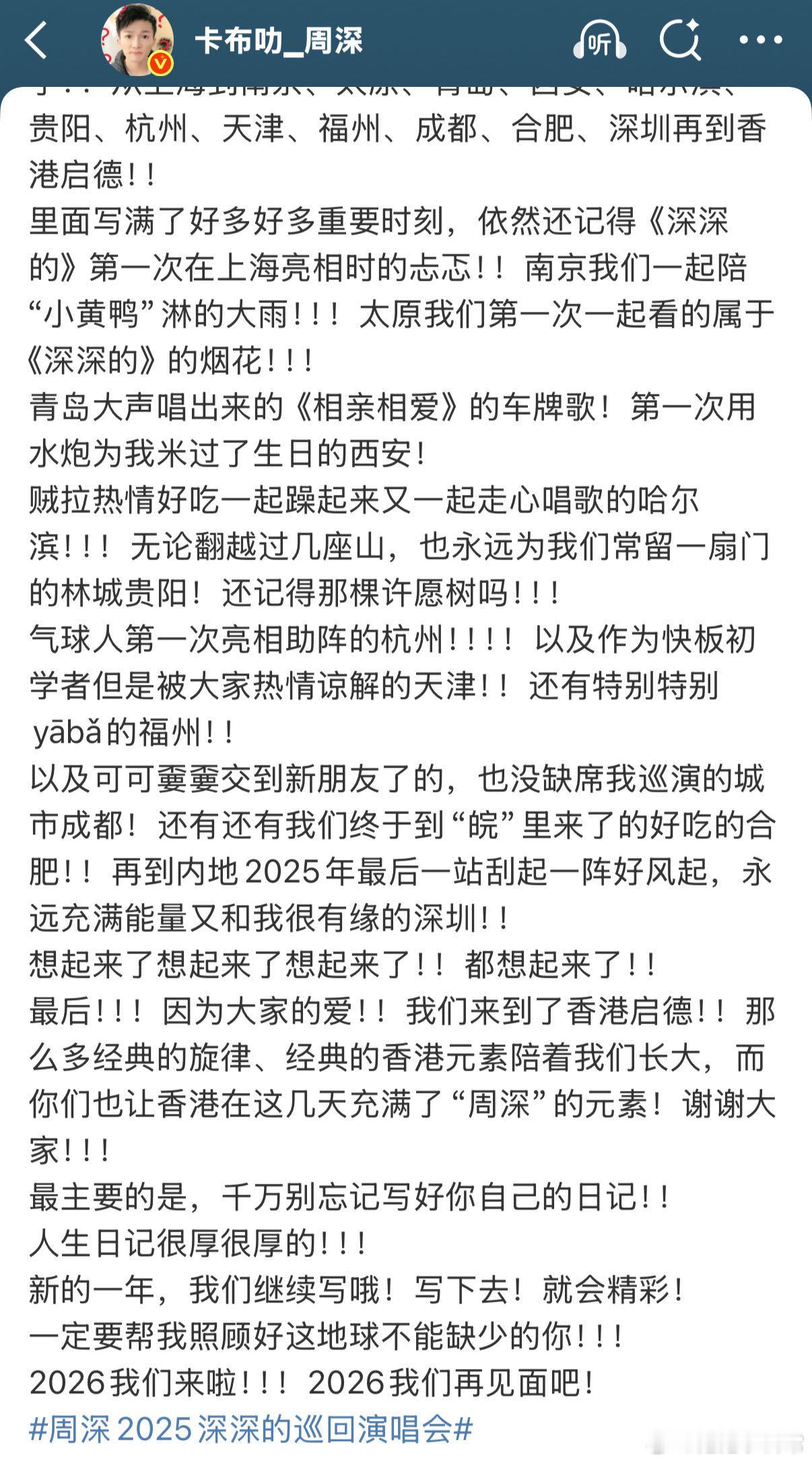 周深发长文 捧着手机一字一句读完周深的长文,满是感慨,他永远记得把粉丝放在心上,把舞台的感动延续到文字里,双向奔赴太美好了