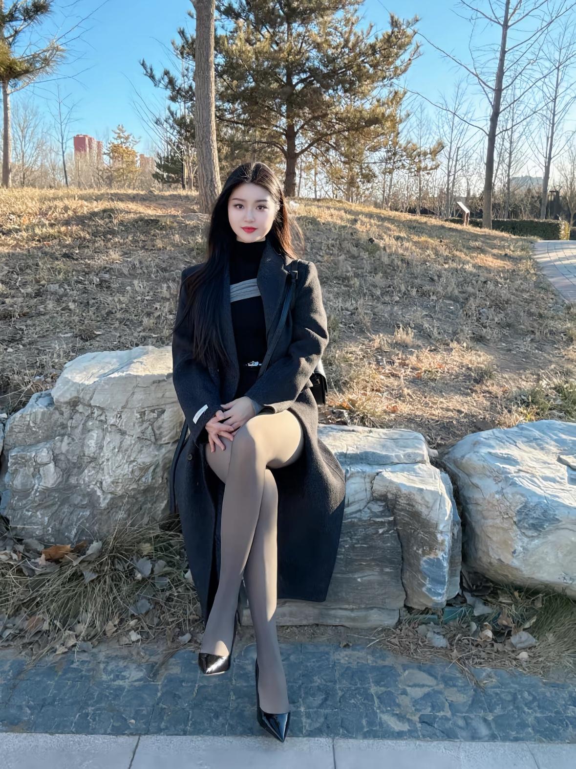 冬日暖阳下,优雅黑裙与自然融为一体,静谧美好。
