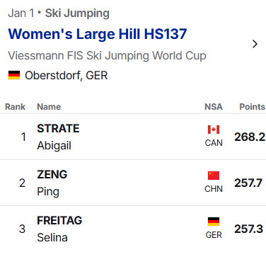 祝贺#曾坪跳台滑雪世界杯摘银创历史#当地时间2026年1月1日,中国运动员曾坪在国际雪联跳台滑雪世界杯德国奥伯斯多夫站比赛中,以两轮总分257.7分的成绩获得银牌。实现了中国队在该项目国际A类赛事中奖牌零的突破,祝贺!