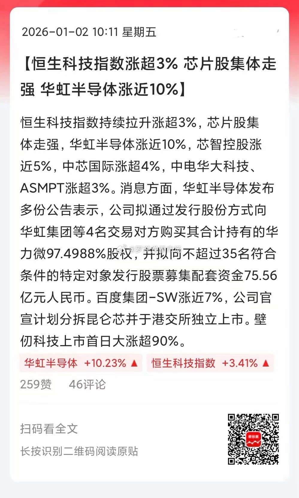 开年第一个交易日,港股就狂飙了。恒生指数涨超2%,恒生科技暴涨近4%,港股最近可是很萎靡的,这到底发生了什么?我觉得最大的原因,就是A股休市。毕竟每次大A休息,全世界都会涨成一片,这已经是优良传统了。还有就是国内不开市,内地资金去干港股了。今天香港涨幅最猛的是半导体、互联网科技股,说明今年主线还是科技啊!