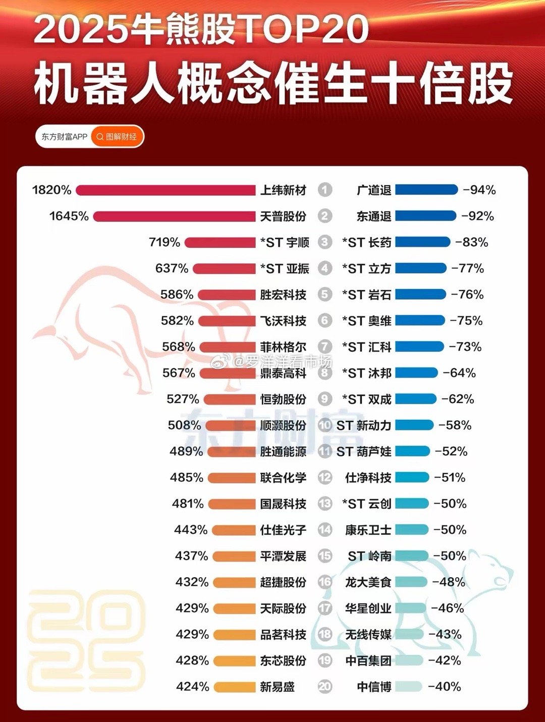 2025A股牛熊股TOP20出炉!机器人概念催生十倍牛股,退市股成跌势主力2025年A股牛熊股TOP20榜单正式揭晓,机器人概念成为超级牛股的核心催化剂,退市股则包揽熊股前列,市场分化态势尽显。牛股阵营中,上纬新材以1820%的涨幅登顶年度“股王”,天普股份紧随其后涨1645%,两只个股均因机器人、AI芯片企业入主实现股价暴涨,*ST宇顺、*ST亚振等重组股也录得超600%涨幅。科技赛道同样表现亮眼,胜宏科技、新易盛分别涨586%、424%,跻身牛股前20,印证了科技主线的强势。熊股方面,退市股占据绝对主导,广道退、东通退分别大跌94%、92%,成为年度跌幅最惨标的;*ST长药、*ST立方等ST股跌幅也超70%,退市风险与经营困境成为股价重挫的主要原因。此外,仕净科技、康乐卫士等个股跌幅超50%,基本面走弱引发资金撤离。整体来看,2025年A股呈现“重组+科技造牛、退市+业绩差造熊”的鲜明特征,机器人、AI等硬科技资产注入成为股价翻倍的核心逻辑,而退市新规下的风险出清则让绩差股加速被市场抛弃。