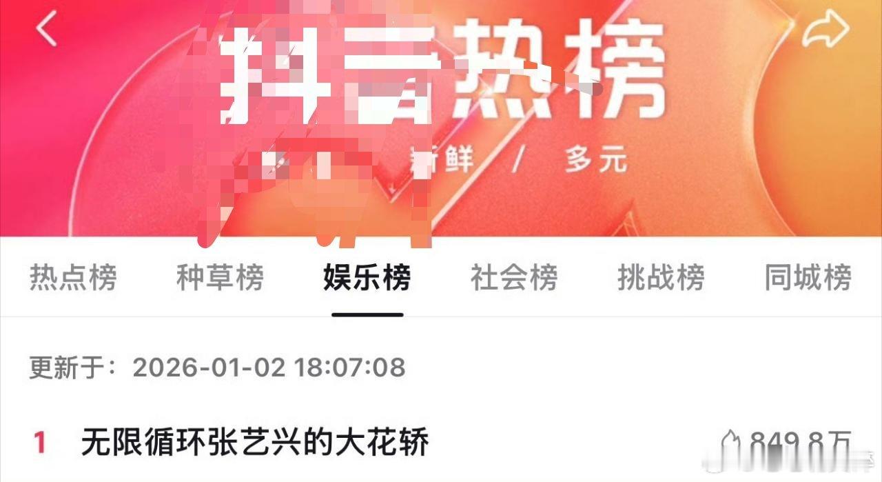 张艺兴跨年舞台《大花轿》斗音爆火出圈!!无任何卫视推流加持直登斗音娱乐榜第一☝?