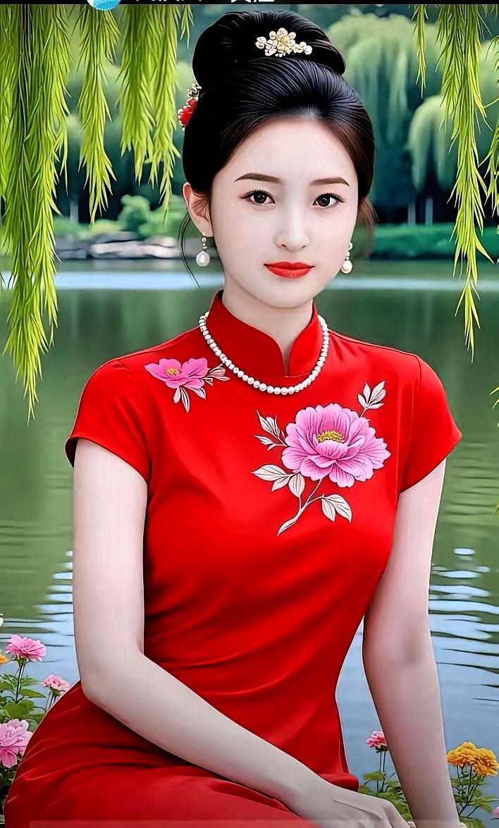 惊艳的古典美人,红衣花影,宛如画中仙子。