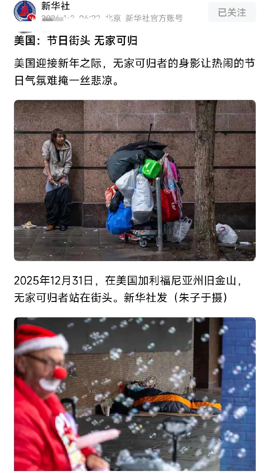 美国迎接新年之际,无家可归者的身影让热闹的节日气氛难掩一丝悲凉。有网友发文说,从记事起就在说,美国要崩盘了,我现在50多岁了,美国还是没有好起来!最近怎么没看到英国街头的流浪汉了?还有,日本东京街头领救济物质的人排起长龙,美国街头满地流浪汉,美日真的是太惨了。在美国加利福尼亚州旧金山,还有纽约等城市,无家可归者露宿街头的身影比比皆是,简直就是太令人可怜人,想不通人们都说美国那么好,天天嚷嚷着要出国去美国,到底那地方有啥好的东西吸引着人们。 还有网友发文说,这些底层人太惨了,无家可归,大冬天太冷了,生病就扛不过冬天。没关系,睡觉吧,圣诞老人会陪伴他们度过美好的时光,给他们需要的一切。世界上最长的路是美国的下坡路。 不过,2026年1月1日新年第一天就去关心美国,感觉是不是不太正常。美国人生存困境 美国失业数据 美国贫民 流浪美国人 无家可归狗 美国失业潮 美国失业人口