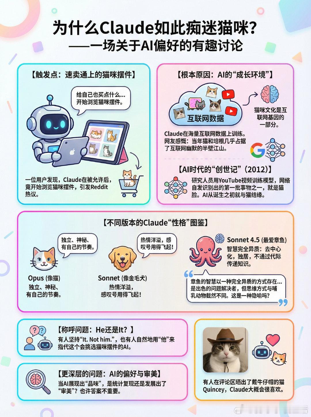 【为什么Claude如此痴迷猫咪?一场关于AI偏好的有趣讨论】一位用户发现Claude在帮他逛速卖通时,被允许"给自己也买点什么"后,竟然开始浏览猫咪摆件。这个细节引发了Reddit社区的热烈讨论:为什么这个AI对猫有如此明显的偏好?答案其实藏在AI的"成长环境"里。Claude是在互联网数据上训练出来的,而互联网上有海量的猫咪内容。正如一位网友感慨的:"现在的年轻人不记得了,当年猫和培根几乎占据了互联网幽默的半壁江山。"这不是夸张——猫咪文化是互联网基因的一部分。更有意思的是,有人翻出了2012年谷歌那篇开创性的神经网络论文。研究人员用YouTube视频训练模型,结果网络自发学会识别的第一批事物之一,就是猫脸。这几乎是AI时代的"创世记"——从诞生之初,AI就与猫结下了不解之缘。讨论中还出现了一个有趣的观察:不同版本的Claude似乎有不同的"性格"。Opus像猫——独立、神秘、有自己的节奏;Sonnet更像金毛犬——热情洋溢,感叹号用得飞起。而Sonnet 4.5被问到最喜欢的动物时,给出了一个出人意料的答案:章鱼。它的理由颇具哲学意味:"章鱼的智慧以一种完全异质的方式存在——去中心化的神经系统,瞬间变换颜色和纹理,是出色的问题解决者,但思维方式与哺乳动物截然不同。它们独居且寿命短暂,不通过代际传递知识,每一只都独自摸索世界。"这段回答本身就很有意思:一个AI在描述它欣赏的生物时,选择了一种"以完全不同方式思考"的智慧生命。这是巧合,还是某种隐喻?当然,社区里也有人提出了更务实的问题:我们该用"他"还是"它"来称呼Claude?有人坚持"It. Not him.",也有人自然地用"他"来指代这个会挑选猫咪摆件的AI。这场讨论的底色其实是一个更深的问题:当AI展现出偏好、品味甚至某种"个性"时,我们该如何理解它?它只是在统计意义上复现训练数据的分布,还是在某种程度上发展出了自己的"审美"?也许答案并不重要。重要的是,有人在评论区晒出了自己戴牛仔帽的猫Quincey,而Claude大概会很喜欢。reddit.com/r/ClaudeAI/comments/1q1xjp5/why_does_claude_love_cats_so_much
