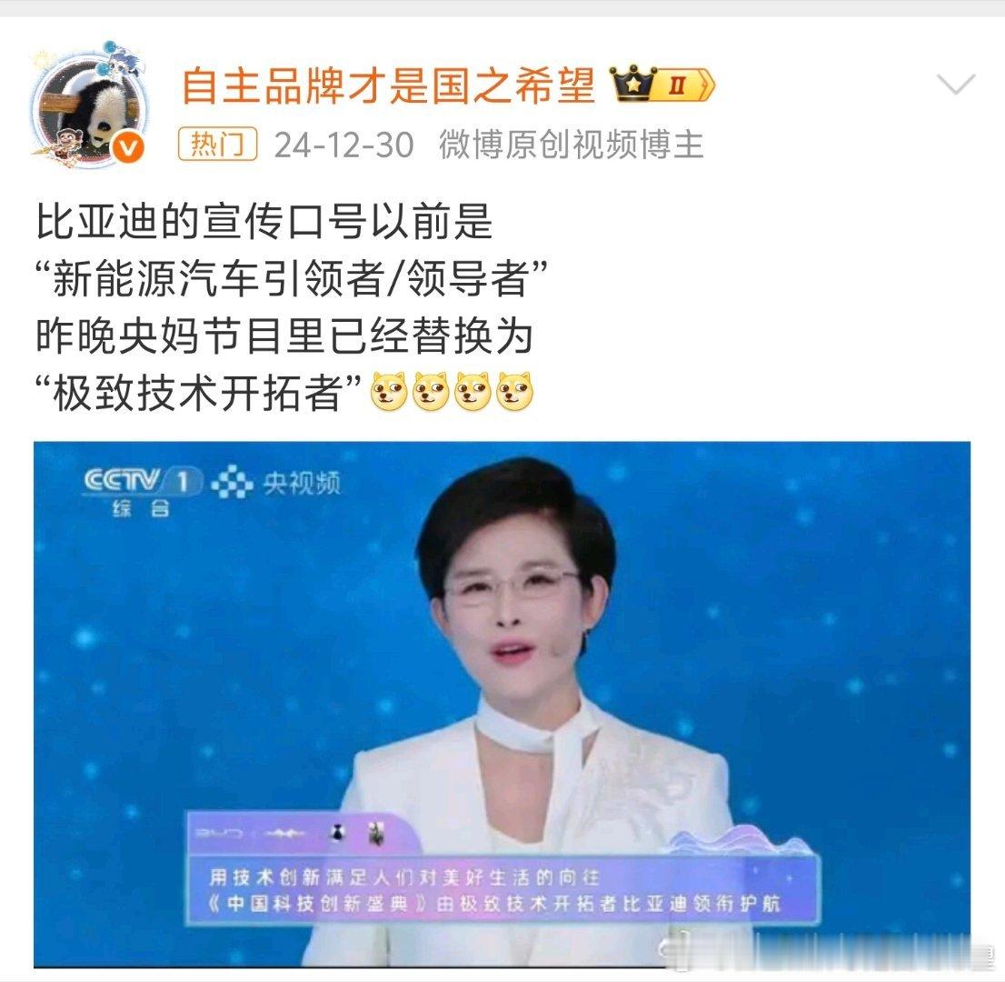 昨天 迪子又赞助了央视的科技春晚其实 24年12月 迪子也赞助了当时的头衔就是 极致技术开拓者今年 还是这个头衔比亚迪主打“技术为王”的科技底蕴从来没变倒是行业里今年多了一群“极致科技开拓者的追随者”