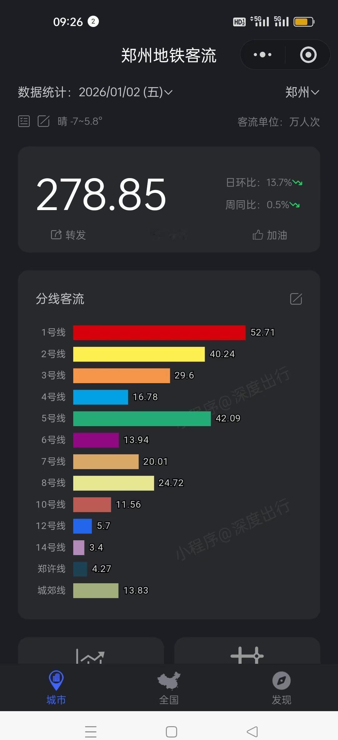 2026年元旦第二天的郑州地铁客流量依然不错,客流强度0.62