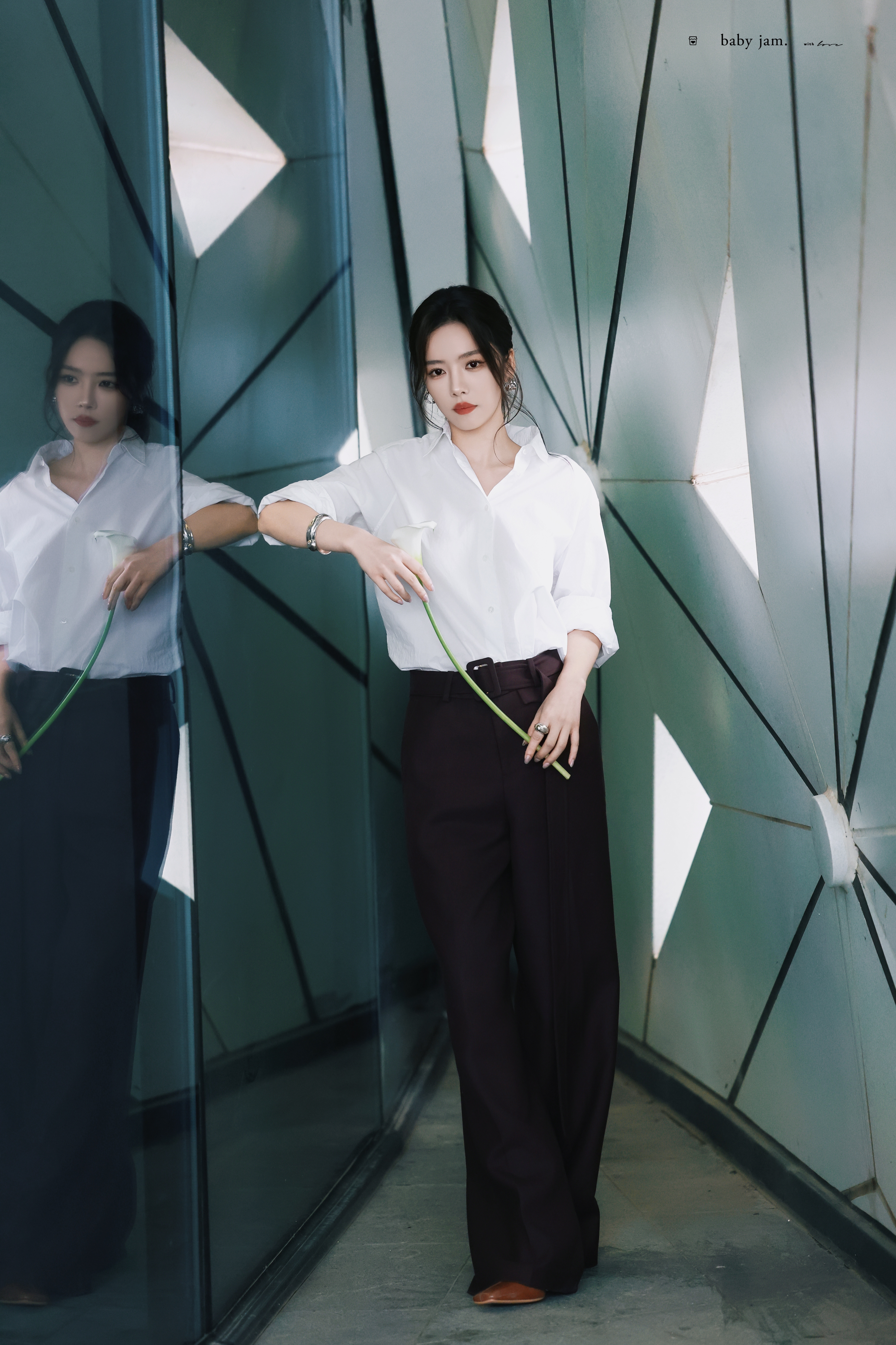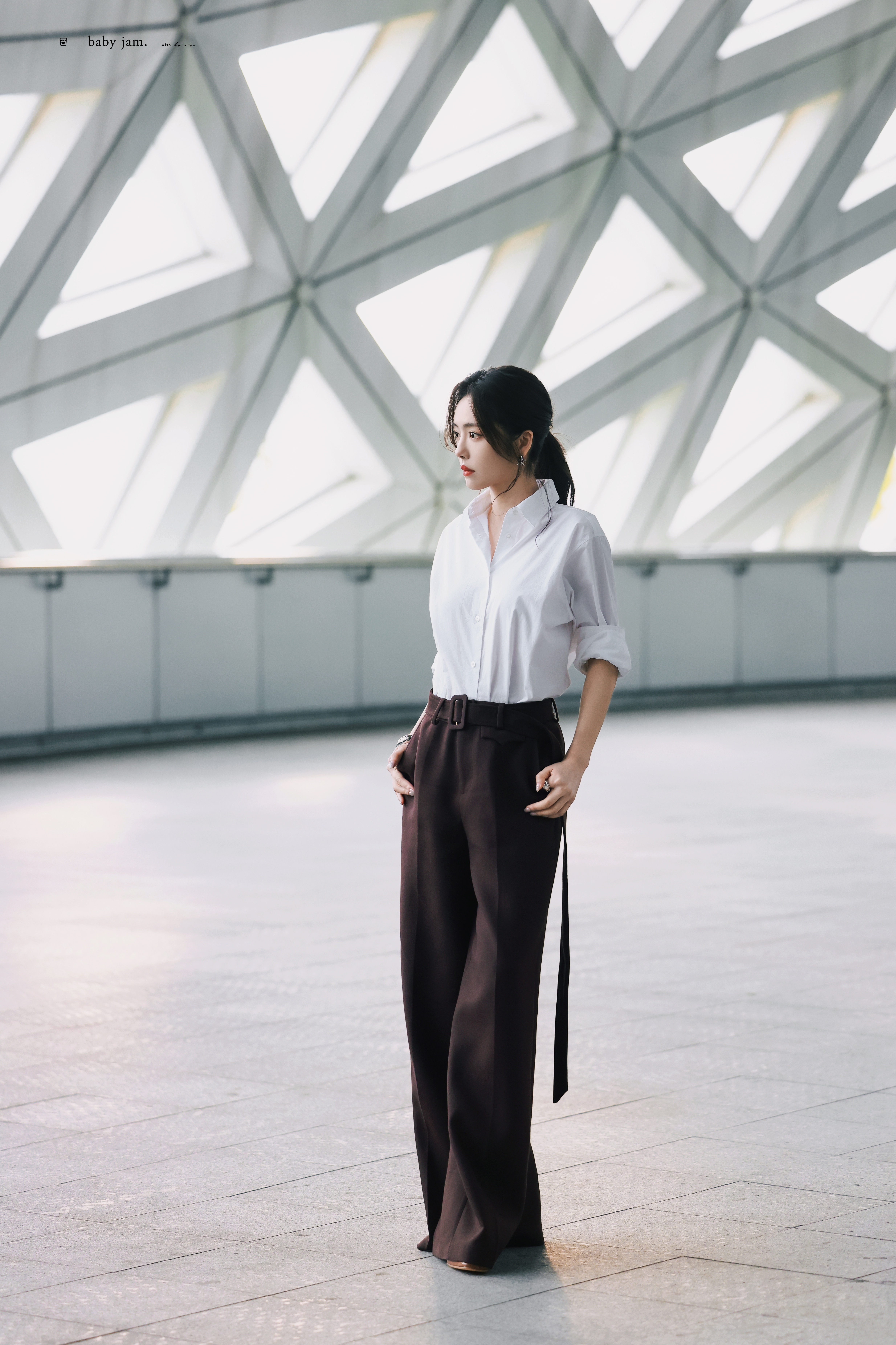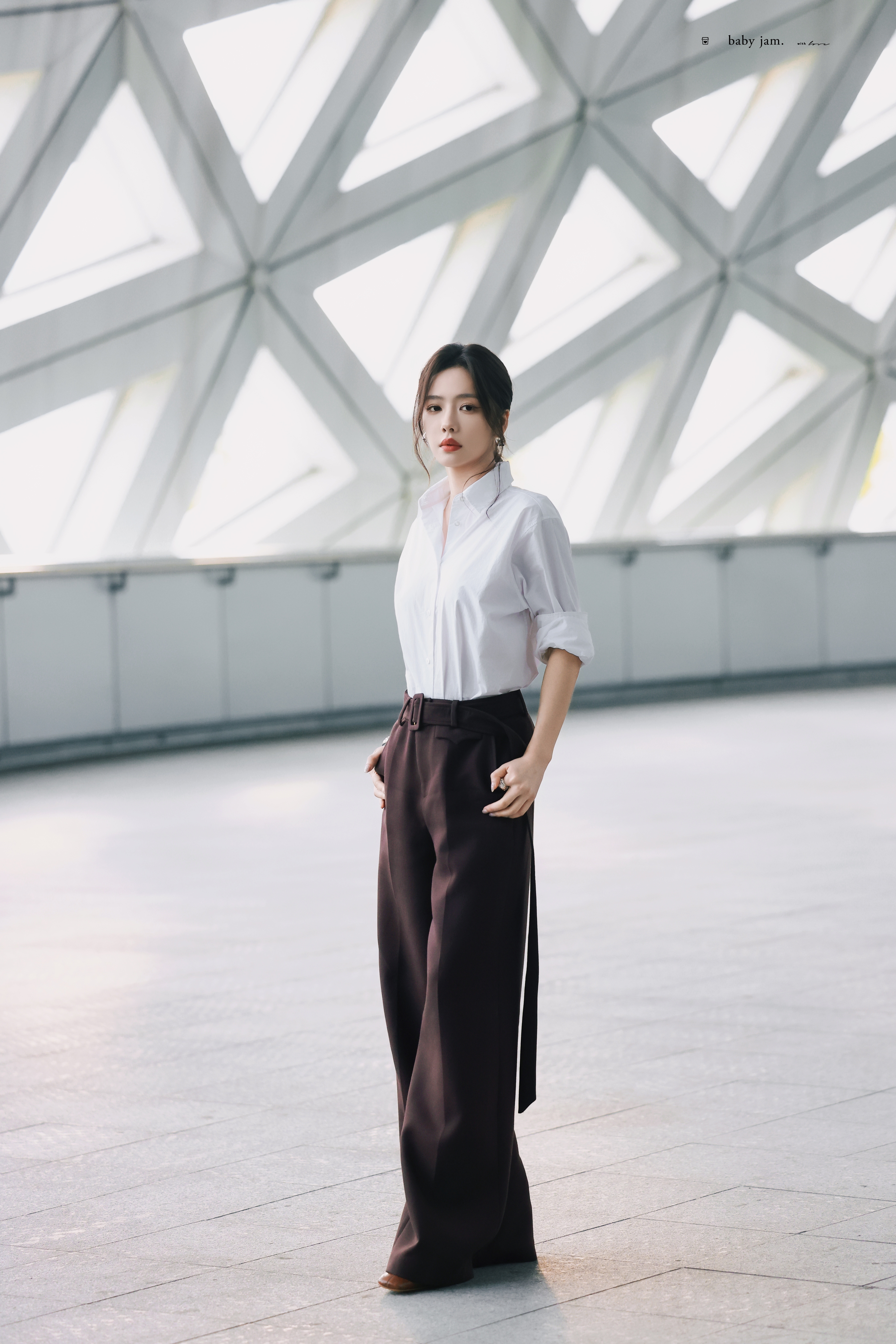 蔡文静 简约白衫衬出清隽风骨,咖色阔腿裤藏着慵懒气场,在几何光影里,把松弛与利落揉成独有的风情。