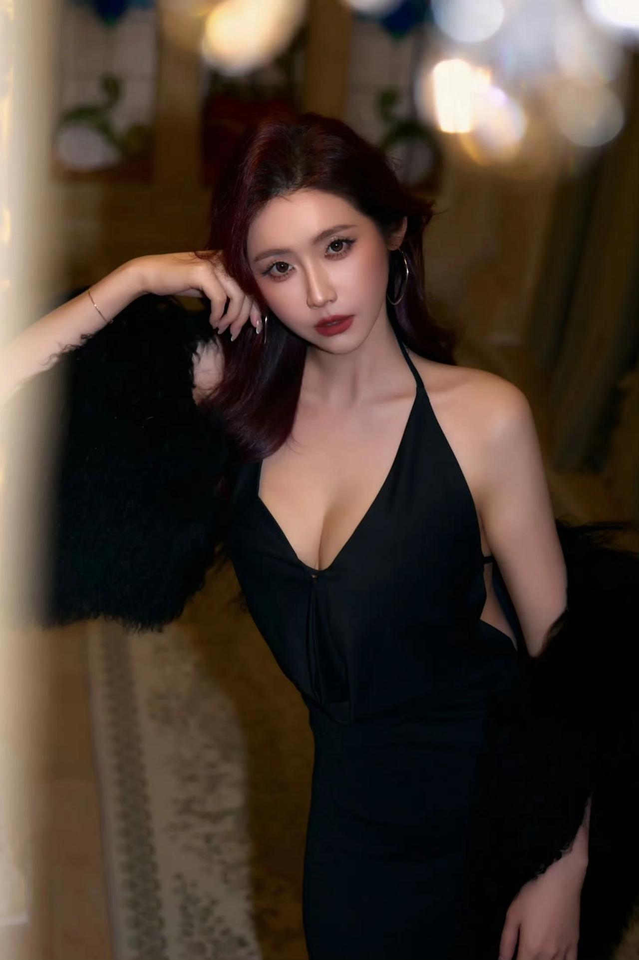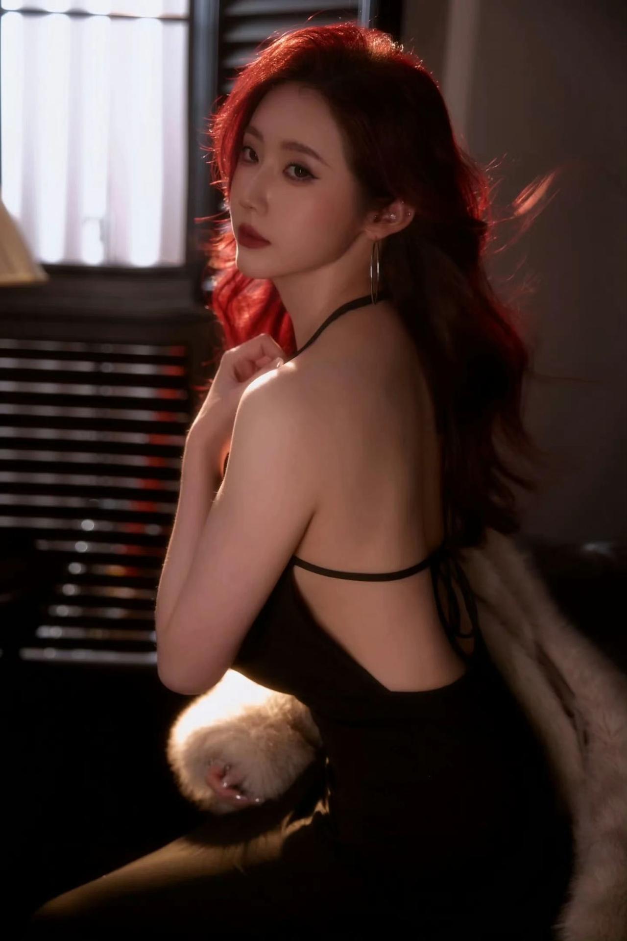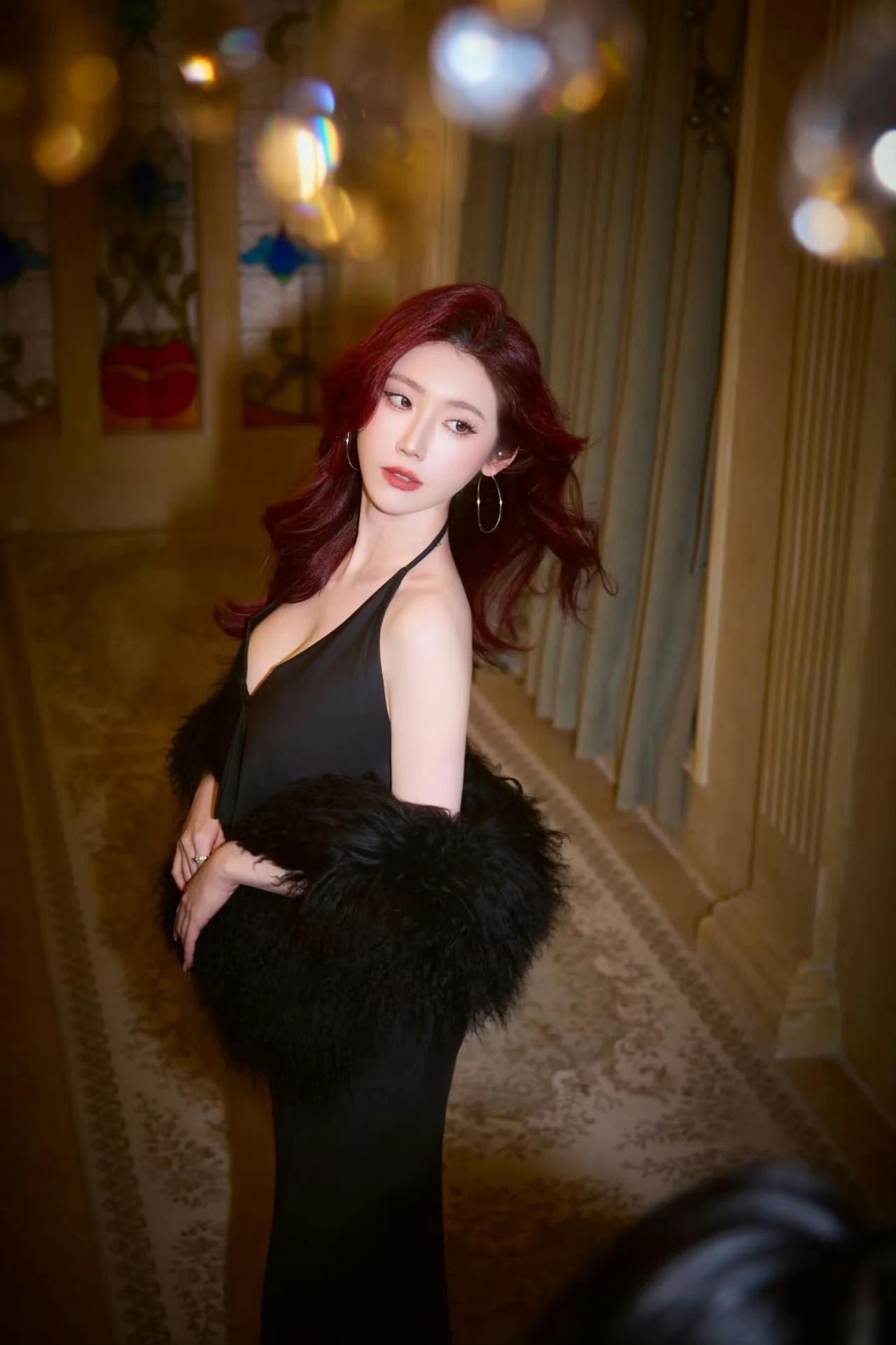 红发少女,性感撩人,黑裙配皮草,时尚大片