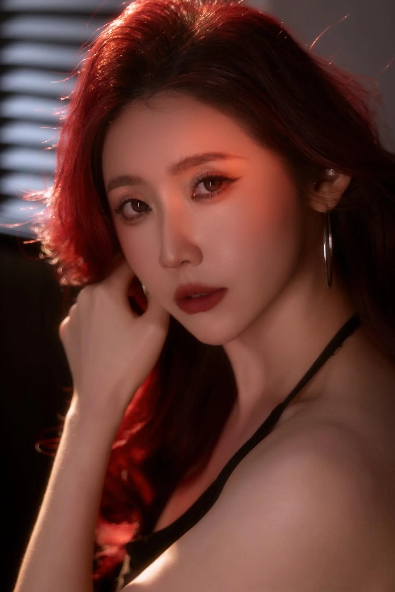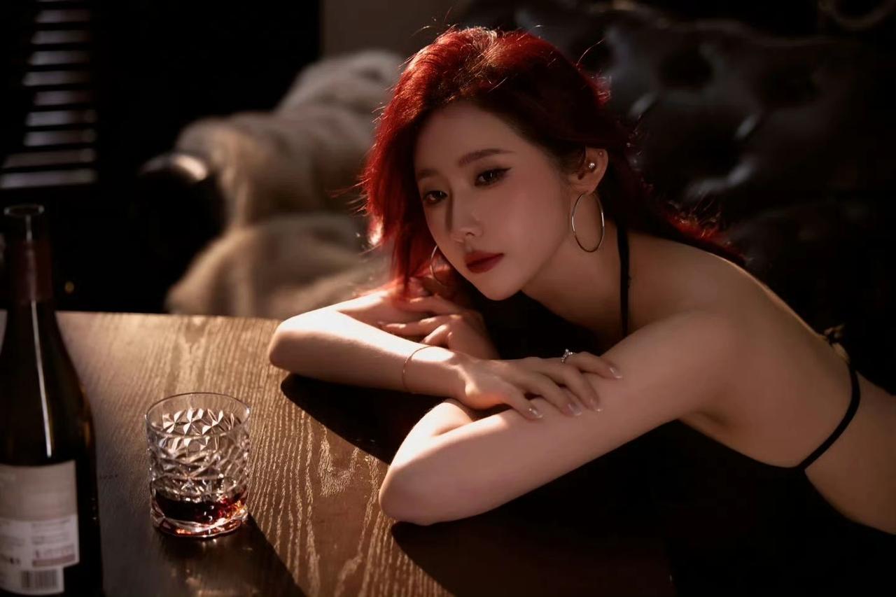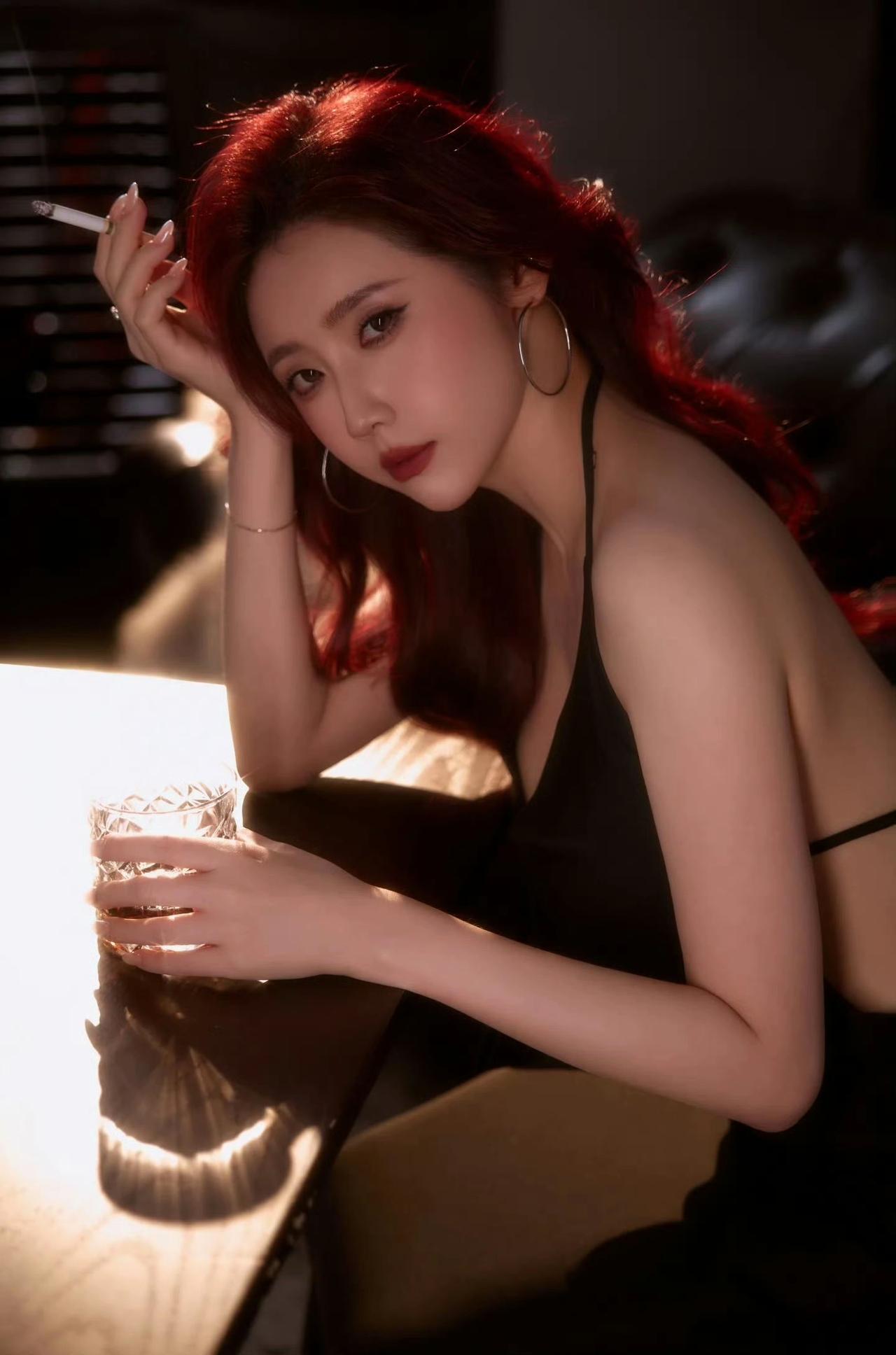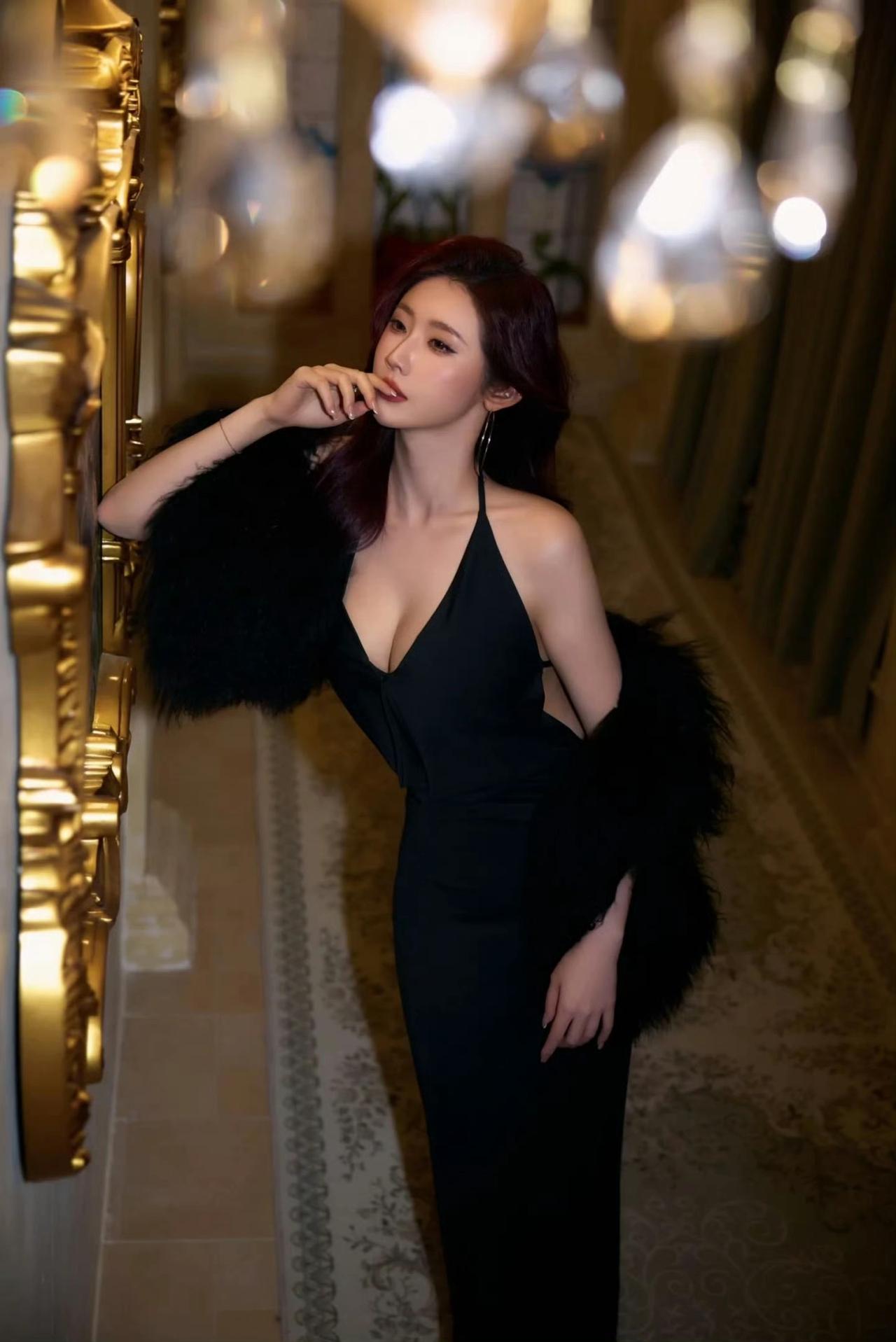 红发少女,性感撩人,黑裙配皮草,时尚大片