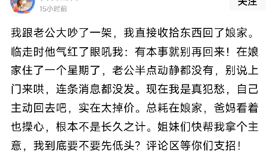 跟老公大吵了一架,就直接收拾东西回了娘家。临走时他气红了眼吼我:有本事就别再回来!有网友发文说,她在娘家住了一个星期了,老公半点动静都没有,别说上门来哄,连条消息都没发。现在她是真犯愁,自己主动回去吧,实在太掉价。总耗在娘家,爸妈看着也操心,根本不是长久之计。她到底要不要先低头? 关键看是因为什么吵架的,如果是你做错了可以主动认错回去,如果不是你的错,他也不道歉不来接,那就坚决不回去,哪怕不呆娘家,出去找份事做都可以。 主要是你们夫妻吵架是什么原因造成的,如果是原则性问题那肯定不能让步,既然你走出来了要把问题处理清楚后回去。如果不是原则性问题,为了家里一些琐事吵架的,那没有什么面子不面子的。两个人总是要有一个人先服软,这个服软不是认可,而是大家让一步。在男人认为他自己没有错的情况下,你走出了家了,他一般是不会来叫你或者是打电话给你。所以,还是自己回去,主动沟通一下,就解决了,不是把事情升级。 还有网友发文说,现在应该是父母送你去夫家再痛骂你一顿!这给你台阶下又给女婿颜面。她俩第一次生气,他说,你回娘家我不去接你!我说,死我也死在这房子里,这也是我的家!父母也说,高兴时候你们谁来都欢迎,你们闹矛盾自己在家解决,别回来!夫妻吵架,双方最忌翻旧账,拿人对比,连带对方父母家庭,其实妻子最想要一个台阶,老公随势递个垫子,什么事就没有了!夫妻吵架感悟 对老公抱怨 夫妻间吵架 对老公表达不满 跟爱人吵架 以后和老公生气 跟婆家人生气