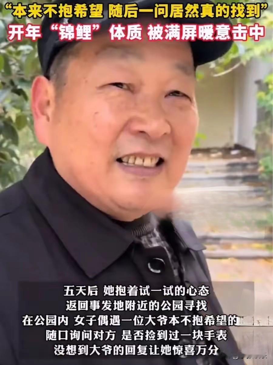 “走是能走,但是估计得按表走了”。26年开年,长沙一女子发视频宣扬了温暖一幕。 女子价值40万的手表在广场附近丢失,五天后,抱着试一试的心态回到事发地寻找。 好巧不巧,女子第一个询问的大爷就是捡到她手表的人,经过再三沟通,大爷脱口而出一句话:“我知道了”,就带着女子来到了一颗树下。 大爷说:“手表我给树戴上了,我在这等失主”看到这一幕的女子也笑出了声来。也在感慨自己十分幸运。 大爷的笑容,憨态可掬,一看就是老实人,大家都在问,大爷一直这样助人为乐的嘛?这要是换个人,这手表的归属可就男说了。