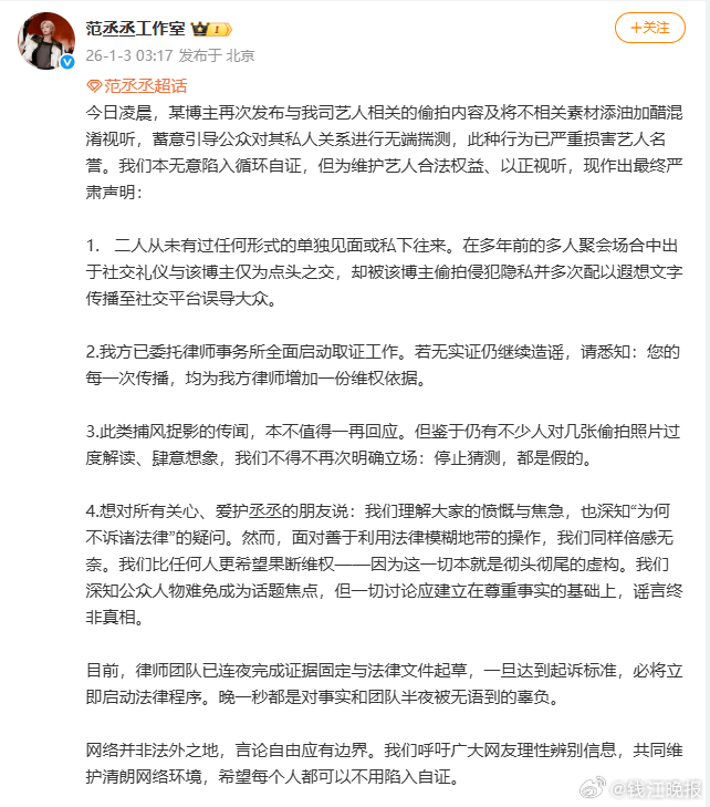 【#范丞丞工作室回应# 否认私下交往】1月3日凌晨,司晓迪#iamroosie#密集发布涉及鹿晗、檀健次、林更新、王安宇等多位明星的爆料,并称与范丞丞有私下往来,引发全网热议。#iamroosie 鹿晗##檀健次工作室发公告# 对此,发布声明↓↓今日凌晨,某博主再次发布与我司艺人相关的偷拍内容及将不相关素材添油加醋混淆视听,蓄意引导公众对其私人关系进行无端揣测,此种行为已严重损害艺人名誉。我们本无意陷入循环自证,但为维护艺人合法权益、以正视听,现作出最终严肃声明:1. 二人从未有过任何形式的单独见面或私下往来。在多年前的多人聚会场合中出于社交礼仪与该博主仅为点头之交,却被该博主偷拍侵犯隐私并多次配以遐想文字传播至社交平台误导大众。2.我方已委托律师事务所全面启动取证工作。若无实证仍继续造谣,请悉知:您的每一次传播,均为我方律师增加一份维权依据。3.此类捕风捉影的传闻,本不值得一再回应。但鉴于仍有不少人对几张偷拍照片过度解读、肆意想象,我们不得不再次明确立场:停止猜测,都是假的。4.想对所有关心、爱护丞丞的朋友说:我们理解大家的愤慨与焦急,也深知“为何不诉诸法律”的疑问。然而,面对善于利用法律模糊地带的操作,我们同样倍感无奈。我们比任何人更希望果断维权——因为这一切本就是彻头彻尾的虚构。我们深知公众人物难免成为话题焦点,但一切讨论应建立在尊重事实的基础上,谣言终非真相。目前,律师团队已连夜完成证据固定与法律文件起草,一旦达到起诉标准,必将立即启动法律程序。晚一秒都是对事实和团队半夜被无语到的辜负。网络并非法外之地,言论自由应有边界。我们呼吁广大网友理性辨别信息,共同维护清朗网络环境,希望每个人都可以不用陷入自证。