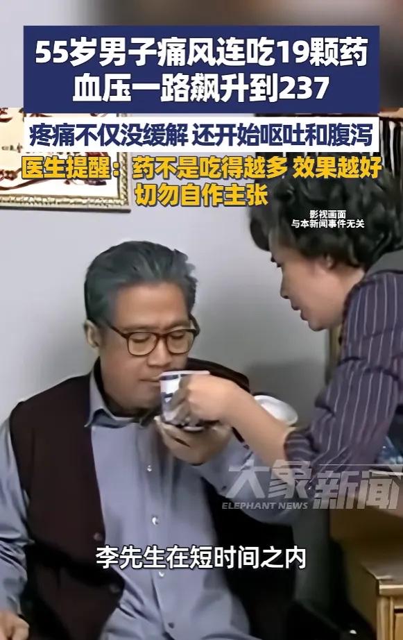 浙江宁波,一男子聚餐后,痛风发作,因受不了关节传来的剧痛,所以连吃了19颗药止痛,结果疼痛不仅没能缓解,还出现了呕吐、腹泻症状,血压更是一路飙升,差点有生命危险!医生:药不是吃得越多越好! 入冬后一个普通的夜晚,55岁的李先生和朋友围坐在火锅店给朋友庆生。热腾腾的汤底翻滚着,海鲜、牛羊肉摆满一桌,大家吃得浑身暖和。谁也没想到,几小时后,这顿热闹的聚餐会以惊心动魄的方式收场。 回到家李先生的脚趾关节突然传来一阵剧痛,他判断是痛风发作了。为了尽快压制疼痛,他短时间内接连吞下10片秋水仙碱和9颗布洛芬。他当时只觉得药吃得越多,效果应该来得越快。 结果剧烈的疼痛没有缓解,反而出现了严重的呕吐和腹泻,人虚弱得站都站不稳,家人发现时,他的血压已经飙升到237/132毫米汞柱,家人立刻将他送往宁波市北仑区第三人民医院。急诊科医生接诊后,发现患者的血压异常“顽固”,团队进行了约两个小时的紧急降压处理,相关指标才逐渐回落至安全范围。 秋水仙碱虽然是痛风急性发作的常用药,但其“治疗窗”很窄,过量服用极易引发严重胃肠道反应。大剂量摄入布洛芬会影响肾脏血流调节功能,可能导致水钠潴留,进而引发血压失控。这两种药的作用叠加,差点酿成无法挽回的后果。 痛风急性发作时,正确的处理方式是休息、减少活动,疼痛明显可在医生指导下服用止痛药,并多喝水促进尿酸排泄。必要时可进行局部冷敷、抬高患肢。关键在于,用药必须严格遵从医嘱,不可自行加量。 药物是帮助我们控制疾病的工具,绝不是用量越多效果越好。尤其是处方药,它们的用法用量背后是严谨的科学依据。盲目加量,无异于将自己置于未知的风险之中。 各位读者你们怎么看?欢迎在评论区讨论。