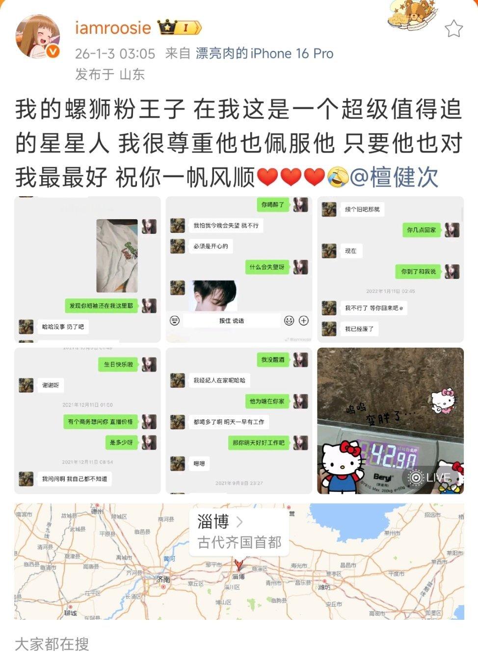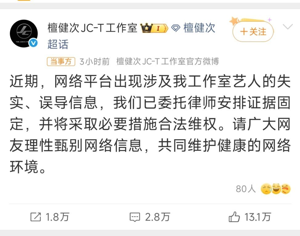 檀健次工作室发公告iamroosie昨天晚上爆的料基本是已经把文娱部全部统治了,今天早上全是各路明星的辟谣和法务通知,忙都忙不过来。目前挂第一的是檀健次的事,那女生发的所谓她和檀健次的聊天记录我也看了,除了第一张什么“你的短袖还在我这里”有点暧昧之外,也没有太多其他有用信息。目前檀健次说是请网友自己理性甄别网络信息。