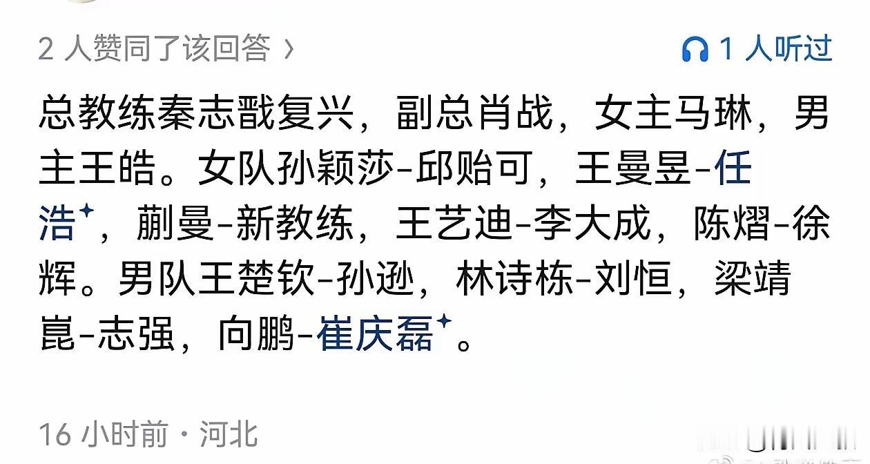 有传言说秦志戬当总教练! 我觉得最不可能的就是他! 首先他是乒协副主席, 职位比总教练高半级吧! 其实他一直在南京乒超联赛, 他还颁奖了, 根本没时间准备的答辩环节! 我觉得最有可能的是马琳, 因为邱贻可的优秀表现, 可以当女乒主教练!