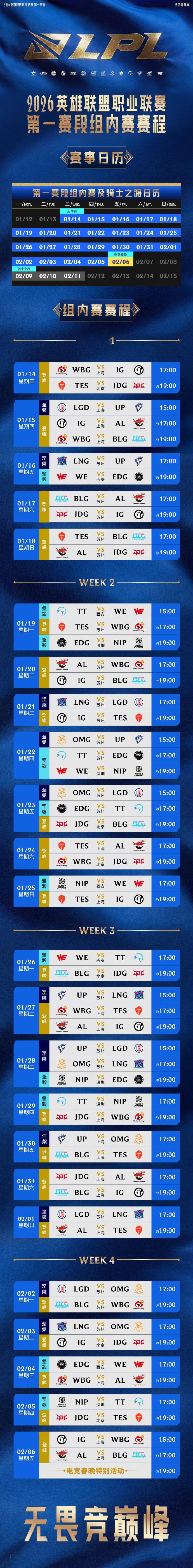 2026LPL第一赛段常规赛组内赛赛程公布,第一赛段将于1月14日正式开赛!14支队伍将根据2025年排名分为3组,分别为登峰组、坚毅组和涅槃组,常规赛组内赛每组将展开组内双循环BO3,双边无畏征召的对决。值得注意的是,大家关注的电竞春晚将在2月6号举行,将由迎来Viper的BLG对战去年战绩优异的AL!2026LPL第一赛段赛程2026LPL第一赛段曝AL与BLG打响电竞春晚曝LPL第一赛段分组