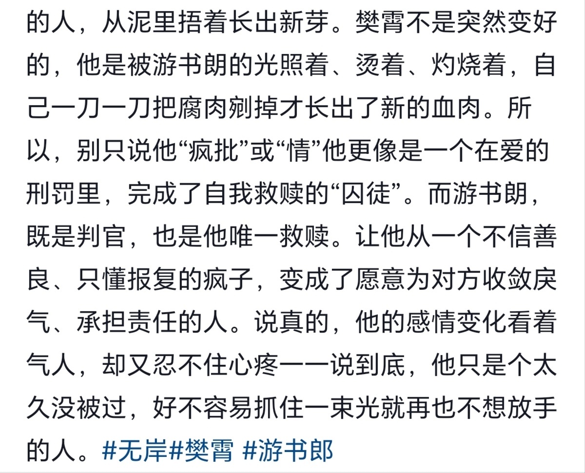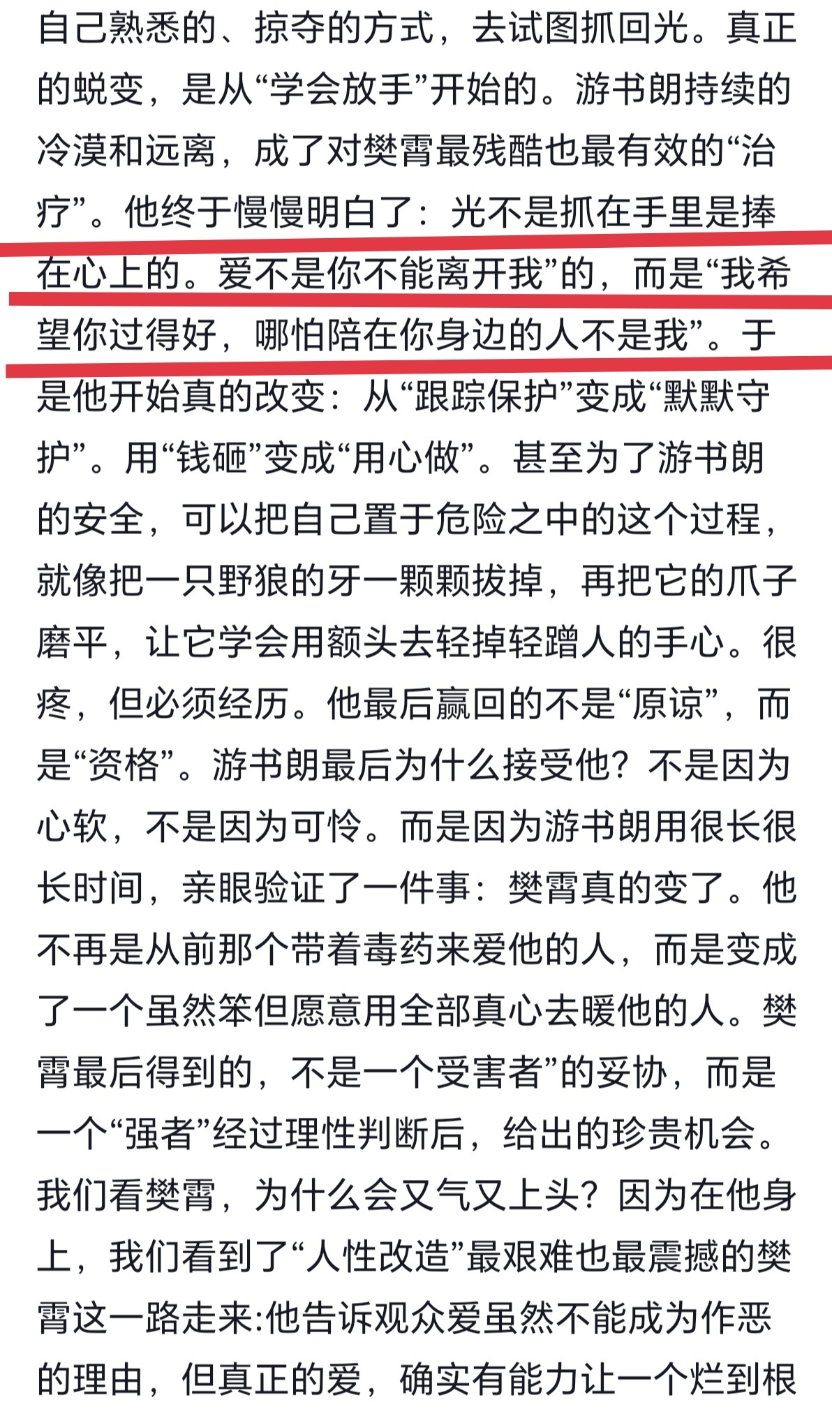 演员云旗 樊宵这个人物角色确实塑造的非常成功,作者让我们看到了一个立体饱满的樊宵,演员演技很好,虽然你把我的游主任虐得那么惨,但看在你对我们游主任专一的份上,我原谅你了。