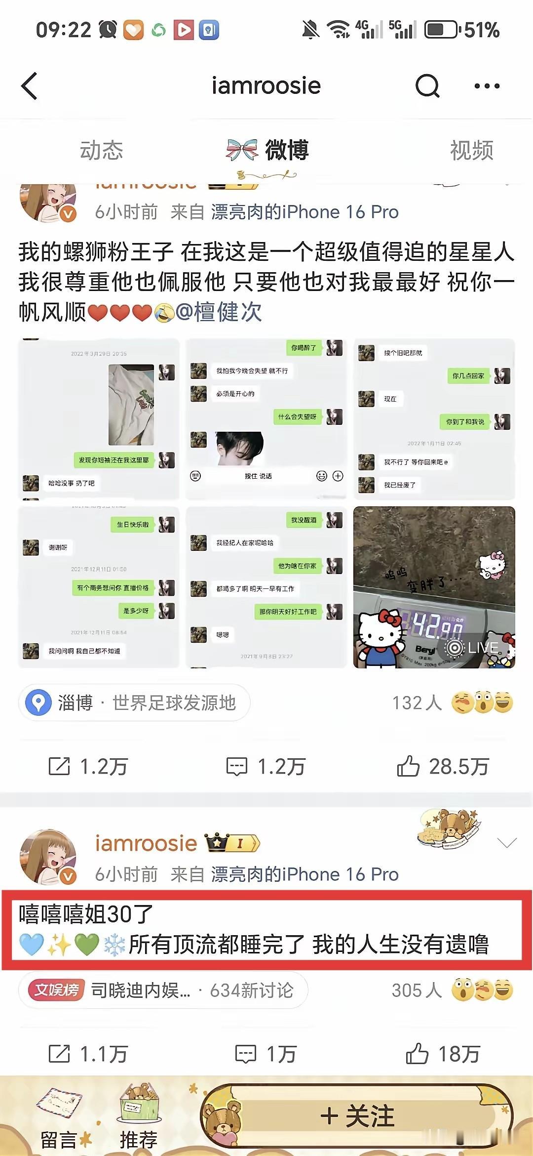 2026年新年大瓜🍉 一位微博昵称叫“iamroosie”的女网红在微博上晒自己30岁了,所有顶流都Shui完了,我的人生没有遗噜…… 虽然不知道说的是那些男顶流,但是也说明了一点,单身的男明星总是爱找漂亮的女网红玩,如果真的加了微信发文字,必然会留下很多聊天记录,就是怕女网红反水的时候,到那个时候你们之间所有不该公开的聊天记录都有可能公开。 不过,这个女网红的爆料是否属实还有待证实。 Chloe VIGIE romi女孩 livarie 女giao圈 Macie dwhobie
