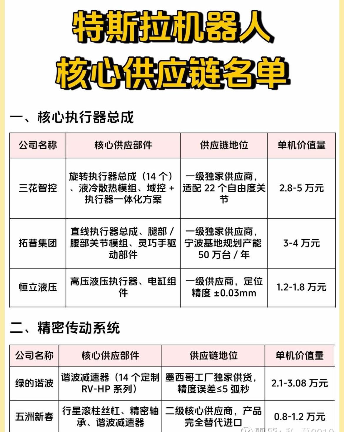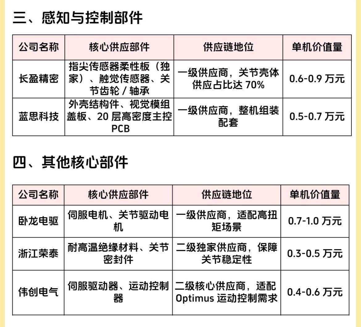 网上看到的图片:特斯拉机器人核心供应链名单及价值量