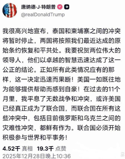 作为美利坚的总统,特朗普本应管好自己的事,搬起石头砸自己脚也很疼,却还是架不住对世界大事充满了巨大的热情,不但关怀斩杀线以上和以下的美国人,还对伊朗正在发生的事表达了关心,甚至还对泰国和柬埔寨的事做出了年度总结。 大统领在社交平台上称“我很高兴的宣布,泰国和柬埔寨之间的冲突将暂时停止,两国将按照我们最近达成的原始条约恢复和平共处”。 简单直白的作出了此等表示,在惹来人们饥笑的同时,也给出了很真实的评价,称其只不过是往身上贴金和揽功,有事没事来点可笑的亲自参与,亲自部署想表达的无非就是做了本该做的事,却生怕别人不知道,只差表示不但以身许了国,还许了世界。