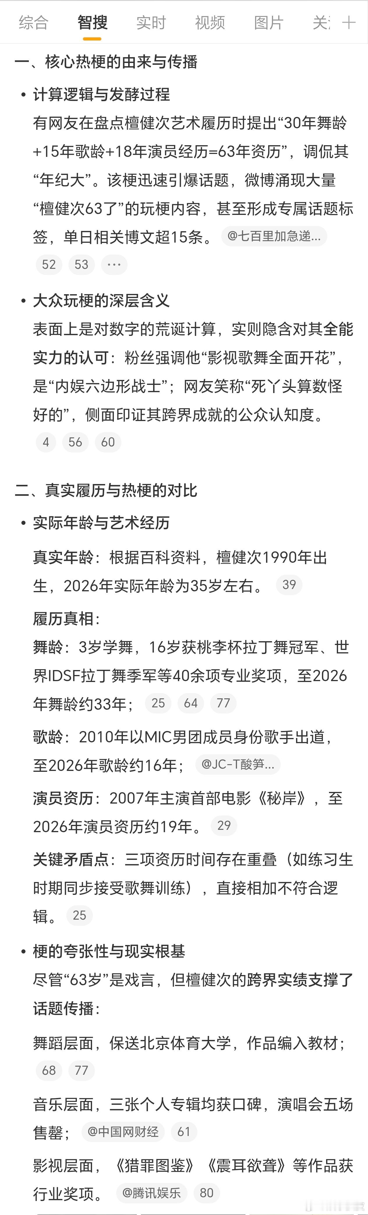 檀健次30年舞龄15年歌龄演员18年就63了 网友将檀健次30年舞龄+15年歌龄+18年演员资历相加,得出“63岁”的搞笑结论哈哈哈哈哈哈哈,檀健次全能艺人,影视歌舞全面发展,都是同时进行的,太优秀了2025娱乐年终盘点非正式跨年派对